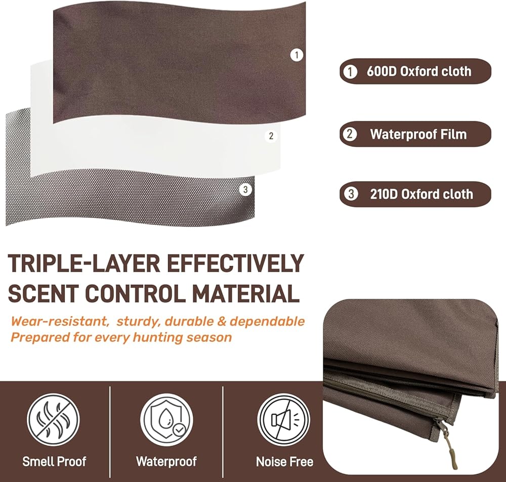 مادة مقاومة للرائحة ثلاثية الطبقات: تتميز هذه الحقيبة المقاومة للرائحة بطبقة خارجية من قماش أكسفورد 600D المتين، وطبقات متوسطة مع غشاء مقاوم للماء مصمم خصيصًا، ومبطنة بقطعة قماش أكسفورد 210D. هيكل من ثلاث طبقات يضمن الحفاظ على ملابسك طازجة وخالية من الروائح. المادة الناعمة والهادئة وغير القابلة للصدأ لن تخيف اللعبة في الميدان، في حين أن أحزمة الحمل المعززة لسهولة حمل الملابس أو المعدات الثقيلة إلى أي مكان صيد