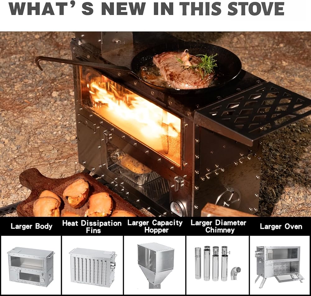 تصميم مطور: يتميز موقد الخيمة بقادوس حبيبات كبير لتحقيق كفاءة تسخين خارجية ممتدة، وفرن أكبر للطهي متعدد الاستخدامات، ولوحة خلفية محسنة تعمل على تحسين الأداء العام في الخيام الأكبر أو الإعدادات الخارجية