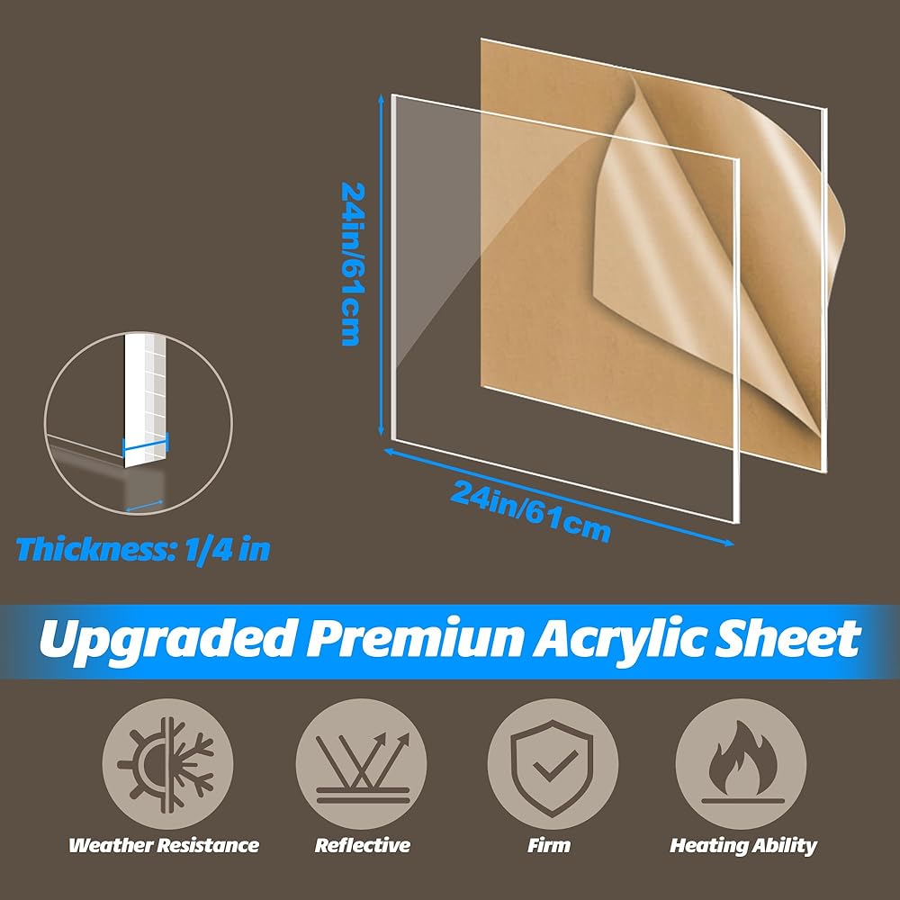 وضوح بصري عالي وخفيف الوزن: بلاستيك الأكريليك الشفاف عبارة عن بوليمر متجانس لدن بالحرارة يُشار إليه غالبًا بالعامية باسم زجاج شبكي. إلى جانب تحسين مقاومة الطقس والأشعة فوق البنفسجية، توفر صفائح الأكريليك الشفافة مقاس 24x24,1/4 وضوحًا بصريًا فائقًا لتسهيل الرؤية من خلالها . علاوة على ذلك، فإن لوح الأكريليك المصبوب يتمتع بقدرة إصلاح أقوى، وأكثر دراسة ولكنه أخف وزنًا من الزجاج. كل لوح زجاج شبكي شفاف مغطى بأفلام وقائية على كلا الجانبين.