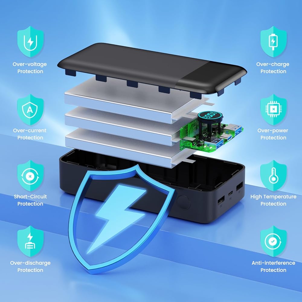 • 【أحدث شحن فائق السرعة بقدرة 25 وات PD 】 يعتمد بنك البطارية بقدرة 50800 مللي أمبير في الساعة أحدث بروتوكول شاحن فائق وبروتوكول شاحن سريع مع منفذ USB-C بمخرج 25 وات. يدعم الشحن السريع QC 4.0، ويستغرق 20 دقيقة فقط لشحن هاتف iPhone 15 الخاص بك من 20% إلى 60%، وهو أسرع 3 مرات من معظم بنوك الطاقة القديمة العادية في السوق.