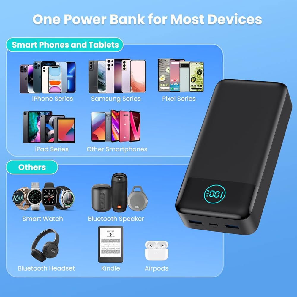 • 【تشغيل 3 أجهزة في وقت واحد】تم تجهيز حزمة البطارية الخارجية للهاتف الخلوي بشاحن محمول بمنفذين USB-A ومنفذ USB-C، ويمكنها شحن 3 أجهزة في نفس الوقت. يتوافق بنك الطاقة المحمول عالميًا مع جميع المنتجات عبر كابل شحن USB، بما في ذلك جميع الهواتف الذكية التي تعمل بنظام iOS وAndroid والساعات وسماعات البلوتوث وما إلى ذلك.