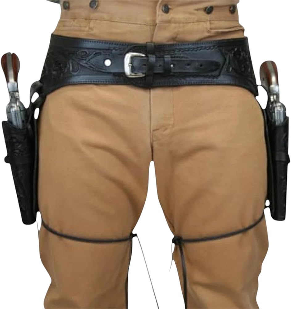 AUTHENTIC DESIGN: Genuine black leather double gun holster belt with intricate western tooling pattern and adjustable buckle closure