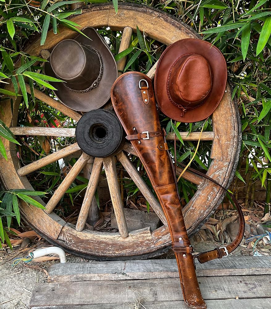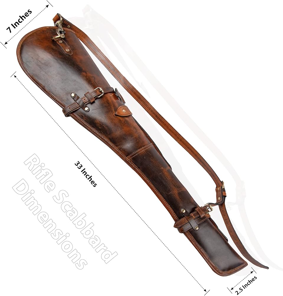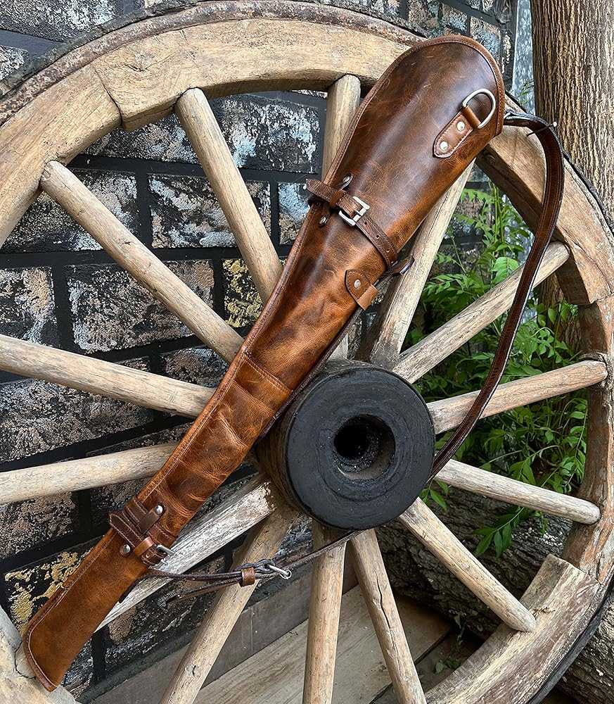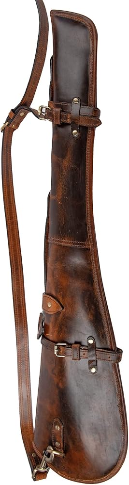 Hulara shotgun rifle gun case, meticulously handcrafted from authentic, full-grain buff leather, boasts robust stitching that ensures longevity. Its rich color variations and detailed tooling highlight its artisanal quality. Designed for convenience, it features a sturdy metal buckle and a leather strap, allowing for effortless attachment to a saddle. This scabbard combines durability with classic style, making it an essential accessory for any rider.