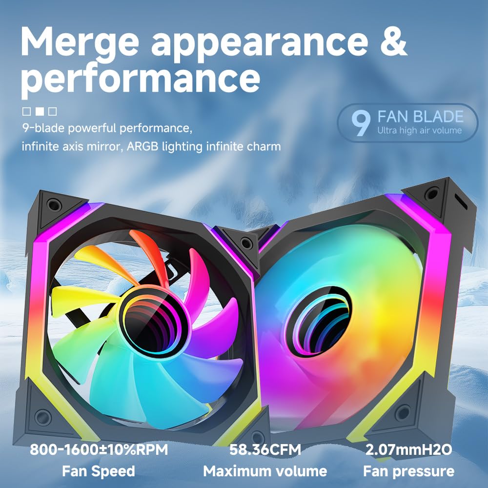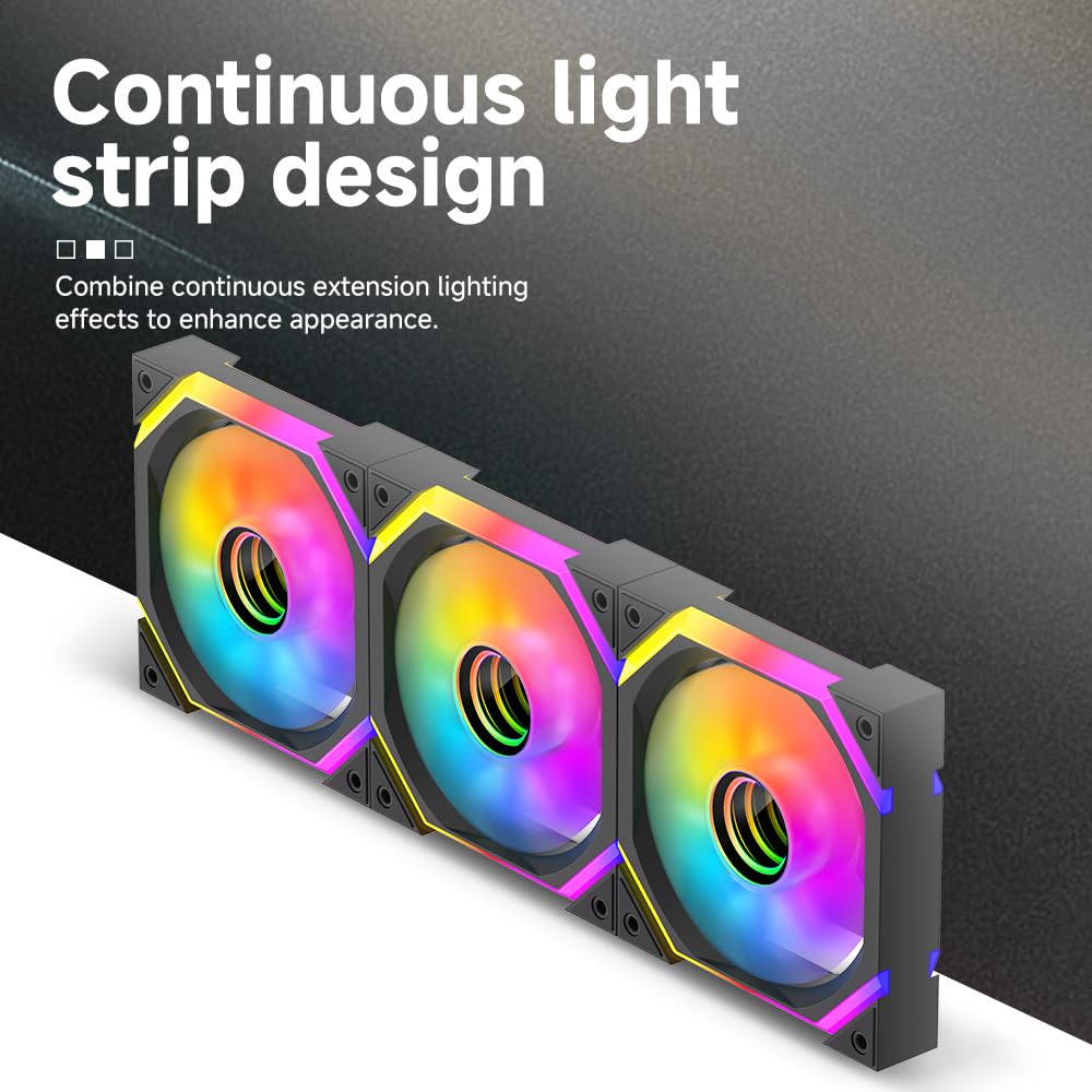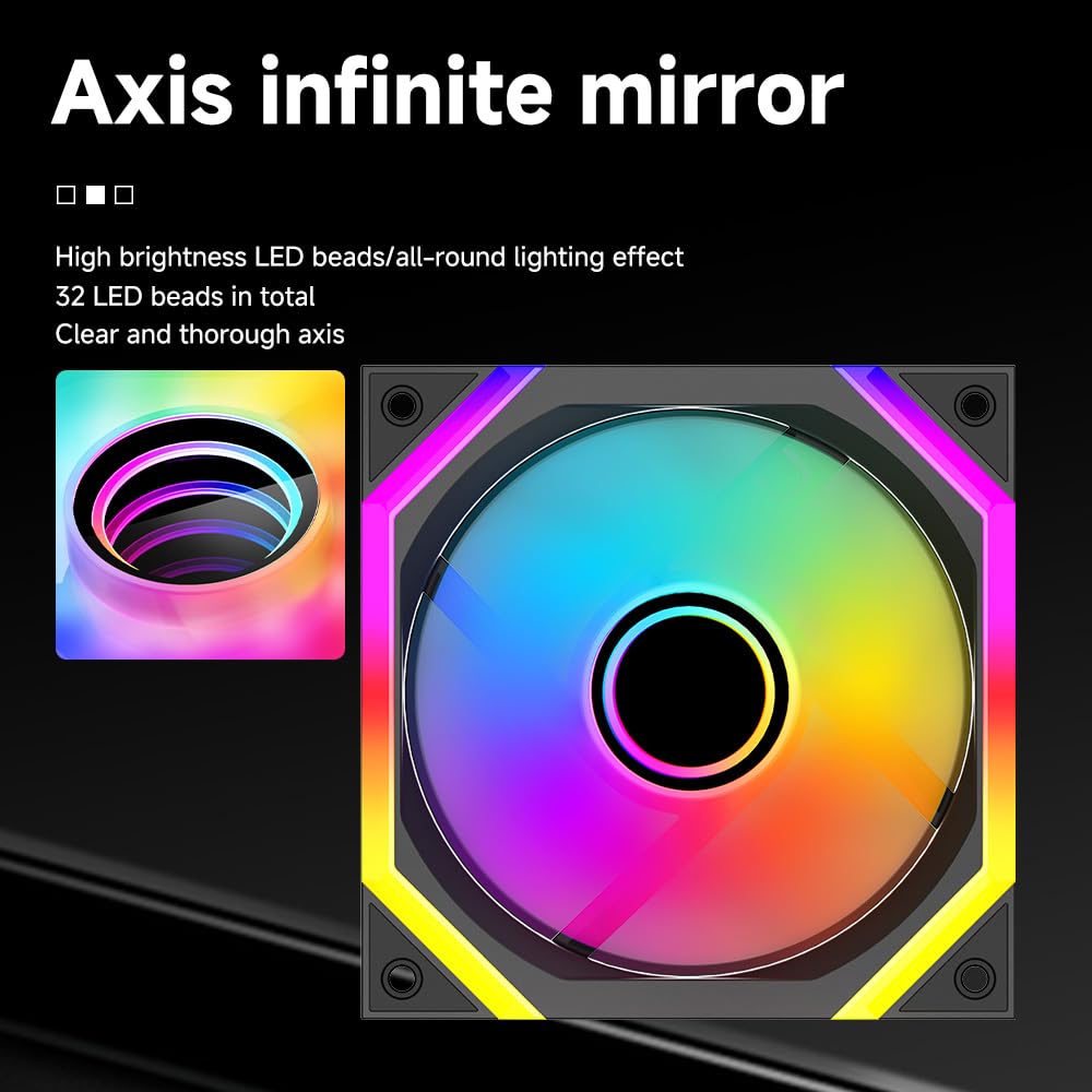 تأثير ضوء ARGB ثلاثي الجوانب: Jungle Leopard Prism 6 MAX 120mm ARGB PC fan تعتمد المرايا الجانبية اللامتناهية على الجانبين الأيسر والأيمن للمروحة على هندسة لا نهائية. يمكن رؤية طبقات متعددة بمسافة 0.5 مم في المرآة اللامتناهية الدائرية الموجودة في وسط المروحة