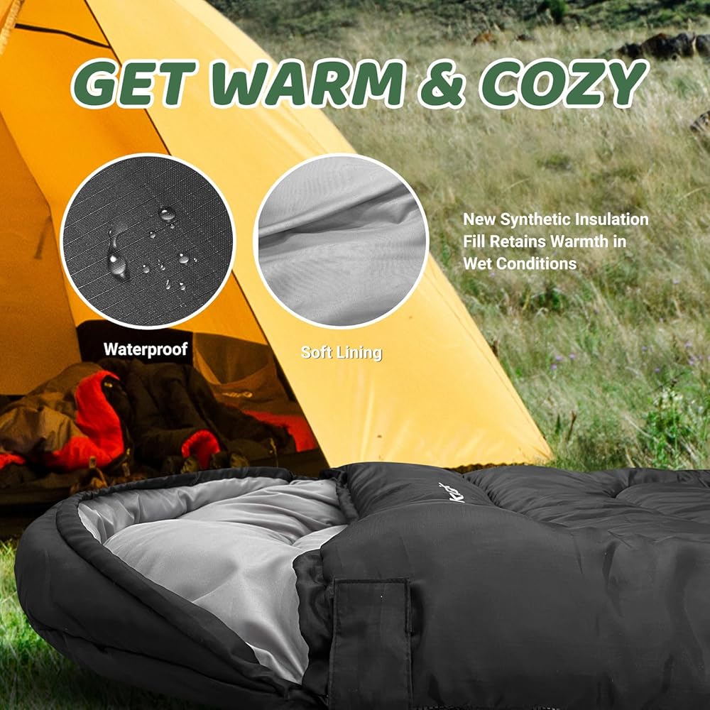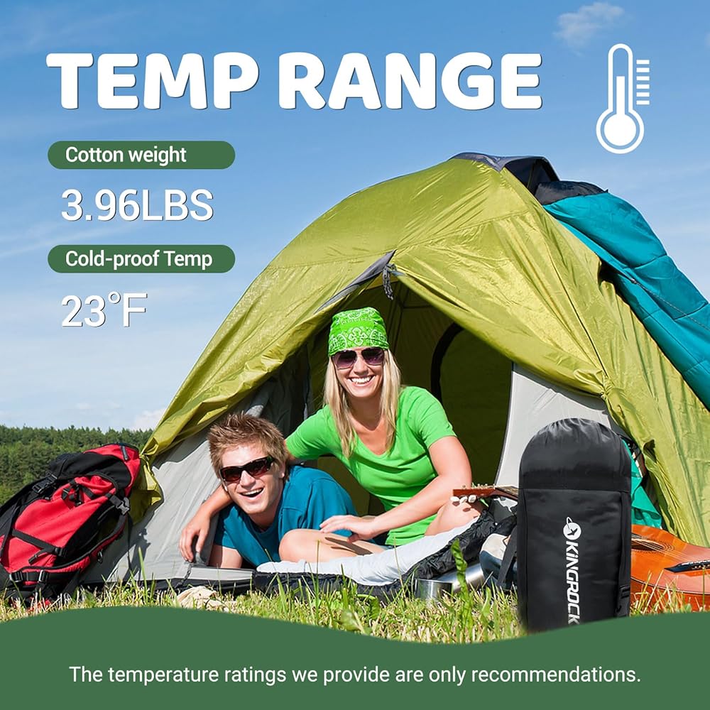 خامة عالية الجودة: حقيبة النوم للتخييم هذه مناسبة للطقس البارد. مصنوعة من البوليستر الخارجي المتين والمقاوم للماء 210T، الحشو من القطن المجوف عالي المرونة للحفاظ على الدفء، وبطانة من القماش المتين المسامي والصديق للبشرة، تحميك حقيبة النوم هذه من الرطوبة والرياح. حقيبة النوم للبالغين مناسبة لدرجات حرارة تتراوح بين 14-23 درجة فهرنهايت. توفر حشوة القطن المجوفة الدفء والعزل لنوم مريح.