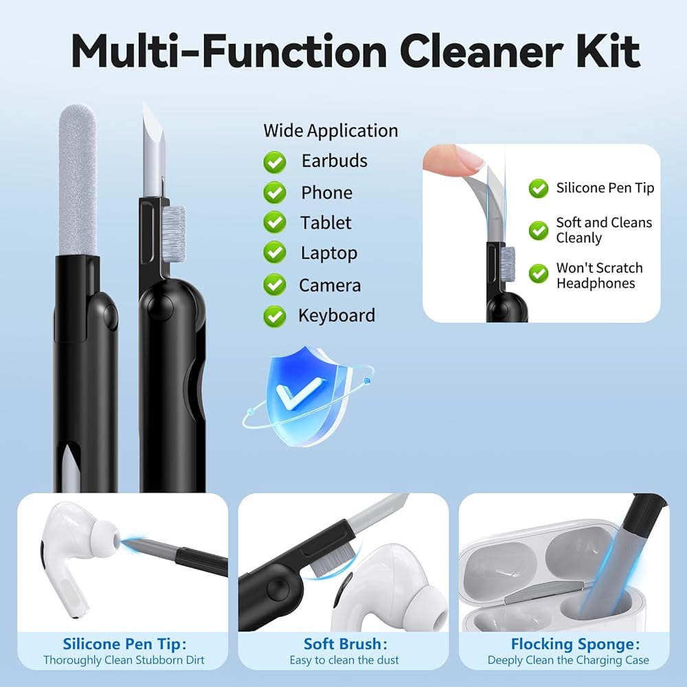 【مع مجموعة تنظيف 3 في 1】: تتضمن مجموعة التنظيف إسفنجة وفرشاة عالية الكثافة ورأس قلم من السيليكون، وتصميم مخفي مزدوج الرأس لتلبية مجموعة متنوعة من احتياجات التنظيف. قم بتنظيف كل منطقة بعمق بدءًا من أصغر شق وحتى علبة الشحن. ينظف بشكل نظيف بينما لن يخدش طرف القلم الناعم سماعات الرأس.