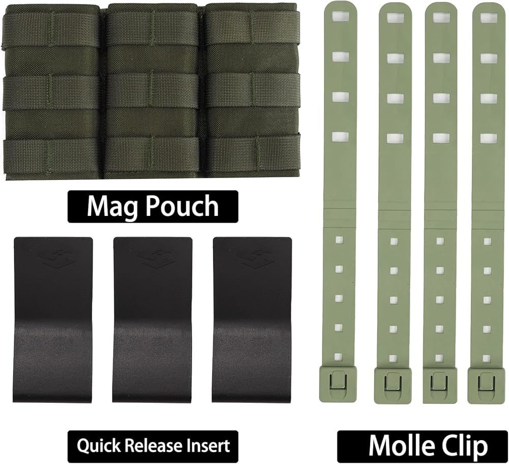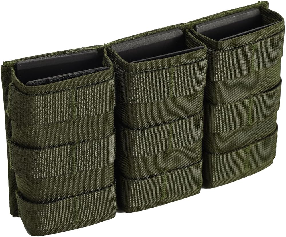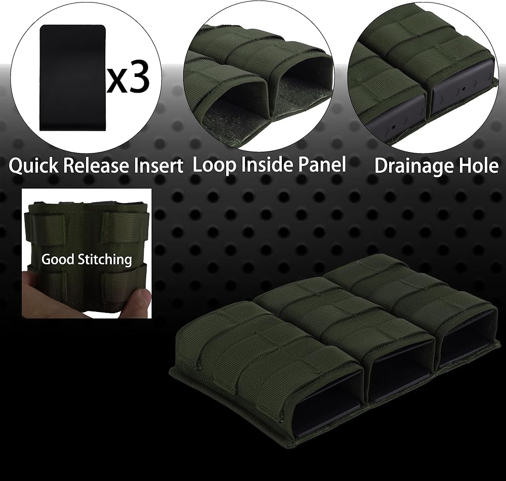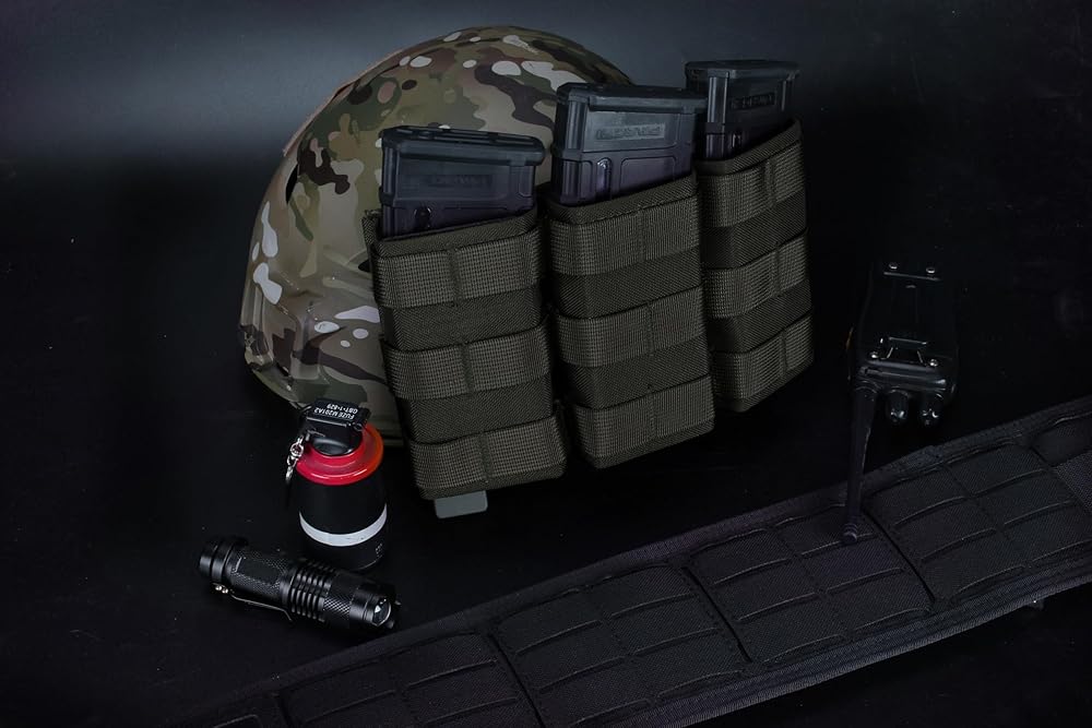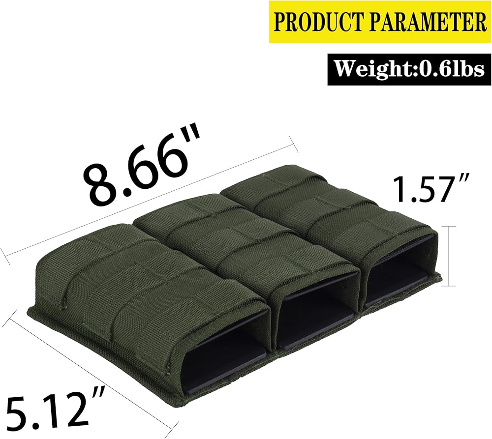 • توافق واسع ومتعدد الاستخدامات: تم تصميم هذه الحقيبة الثلاثية بنظام MOLLE و4 مشابك MOLLE، ويتم ربطها بسلاسة بالسترات التكتيكية والأحزمة وأجهزة الصدر. وهي تحمل معظم المجلات 5.56 ويمكنها أيضًا تخزين العناصر ذات الحجم المماثل مثل المصابيح الكاشفة أو أدوات EDC أو المفاتيح. يسمح حزام MOLLE الأمامي بإرفاق أكياس إضافية، مما يعزز وظائفها