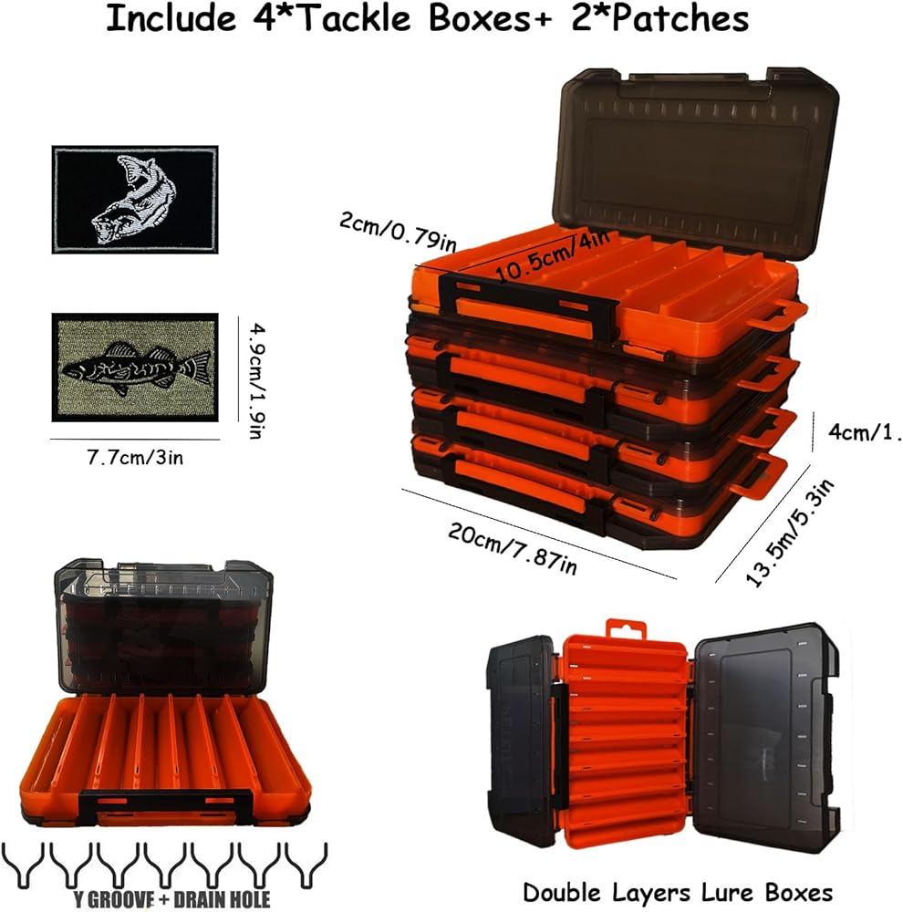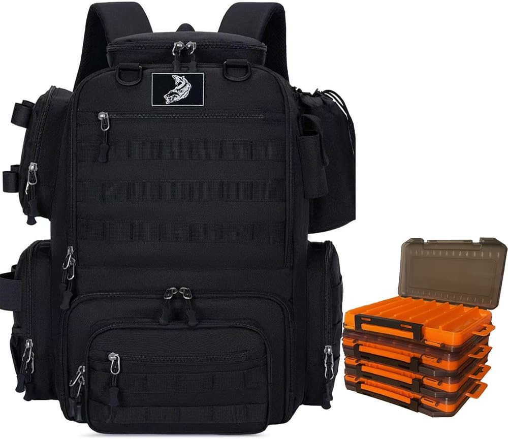 Included 4 PCS Tackle Boxes and 2 PCS Fish Patches: This Large fishing backpack comes with 4 tackle boxes (20x13.5x3.6cm) for organized fishing gear storage + 2 durable fish patches (7.8x4.8cm) to customize gear bag. The tackle boxes feature double layers for large space.
