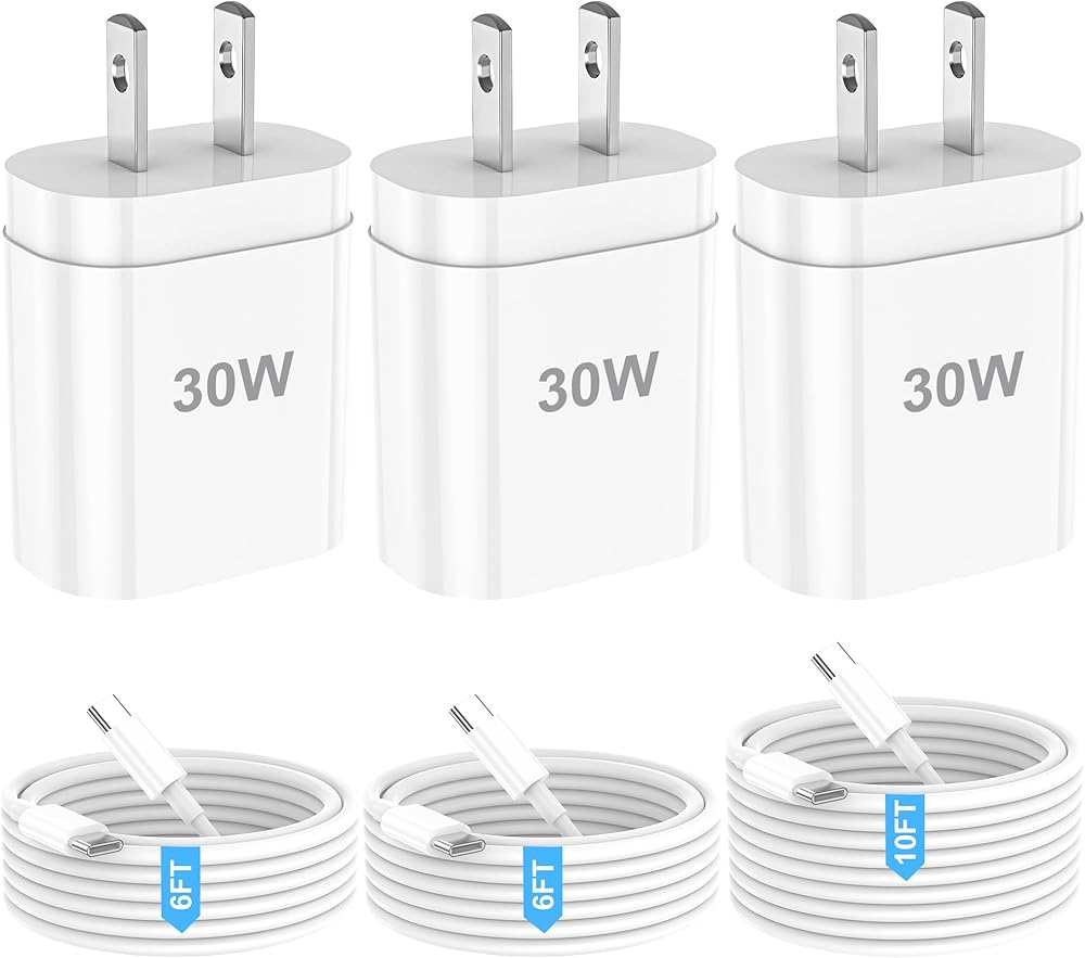 شاحن USB C شحن سريع لهاتف iPhone 15/16 Pro/Pro Max، كتلة شاحن USB C سريع بقدرة 30 وات مع سلك كابل طويل من النوع C بطول 6 أقدام و10 أقدام لهاتف iPhone 16/15 Plus/iPad Pro 12.9/11/Samsung/Android (3 عبوات)