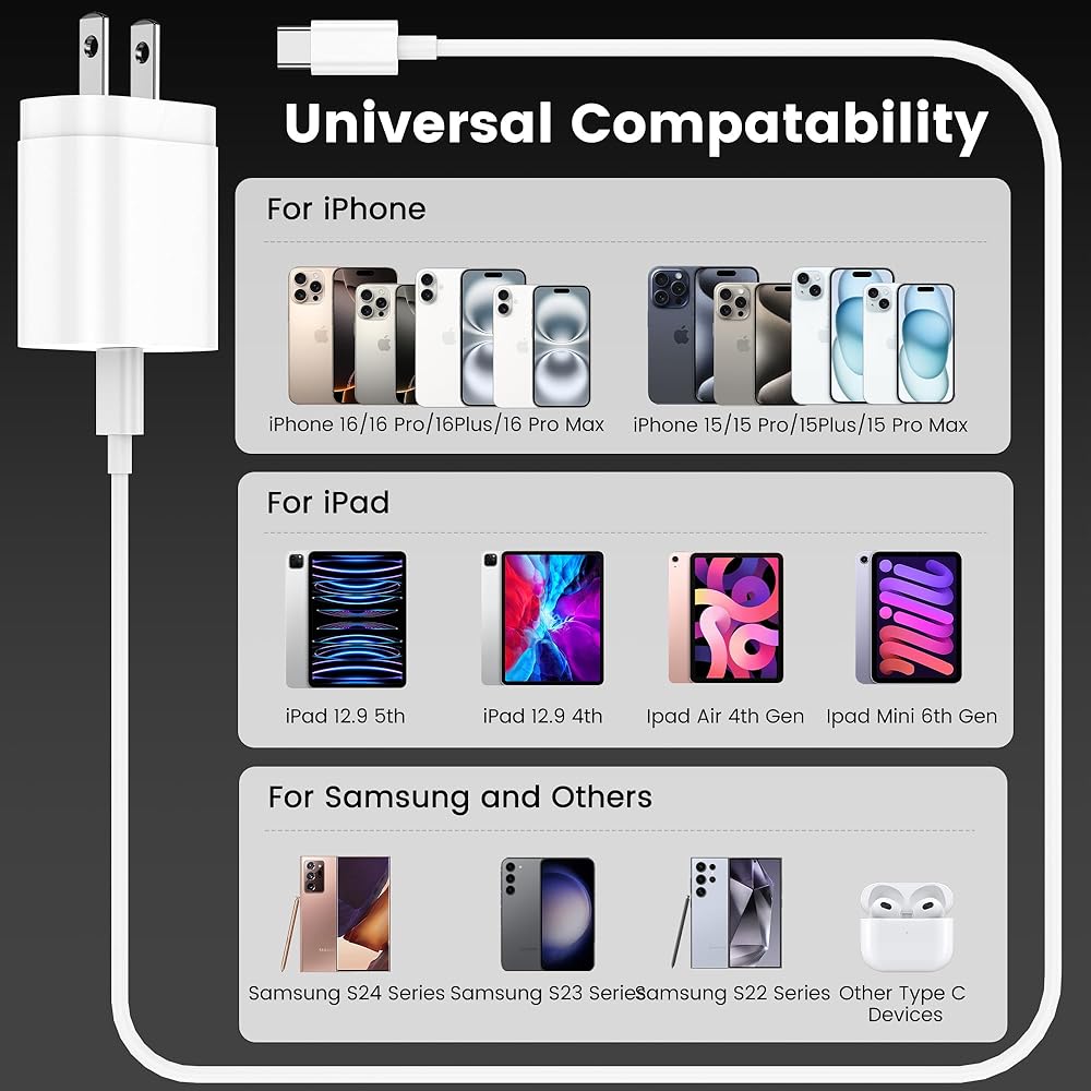 مجموعة شاحن كاملة مكونة من 3 قطع: تتضمن 3 كتل شحن USB-C و3 كابلات شحن (2 × 6 أقدام و1 × 10 أقدام USB-C إلى C)، مما يمنحك المرونة للمنزل والمكتب والسفر مع ضمان حصولك دائمًا على حل شحن سريع