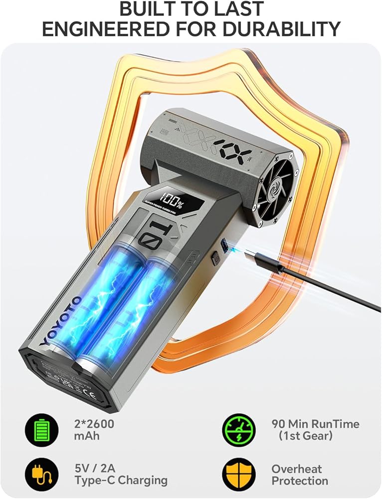 【طاقة آمنة وطويلة الأمد】تخلص من العلب للأبد. تعمل ببطارية 5200 مللي أمبير في الساعة، توفر منفضة الهواء القابلة لإعادة الشحن هذه من 15 إلى 60 دقيقة من وقت التشغيل (قابلة للتمديد إلى 90 دقيقة بسرعة منخفضة). ويتميز بشحن سريع من النوع C عبر الكمبيوتر أو بنك الطاقة أو شاحن السيارة، مما يجعله إضافة متعددة الاستخدامات لمجموعة الأدوات. توفر الشريحة الذكية حماية متعددة (الحرارة الزائدة/التيار الزائد/وما إلى ذلك) لضمان السلامة الشاملة وإطالة عمر الجهاز.