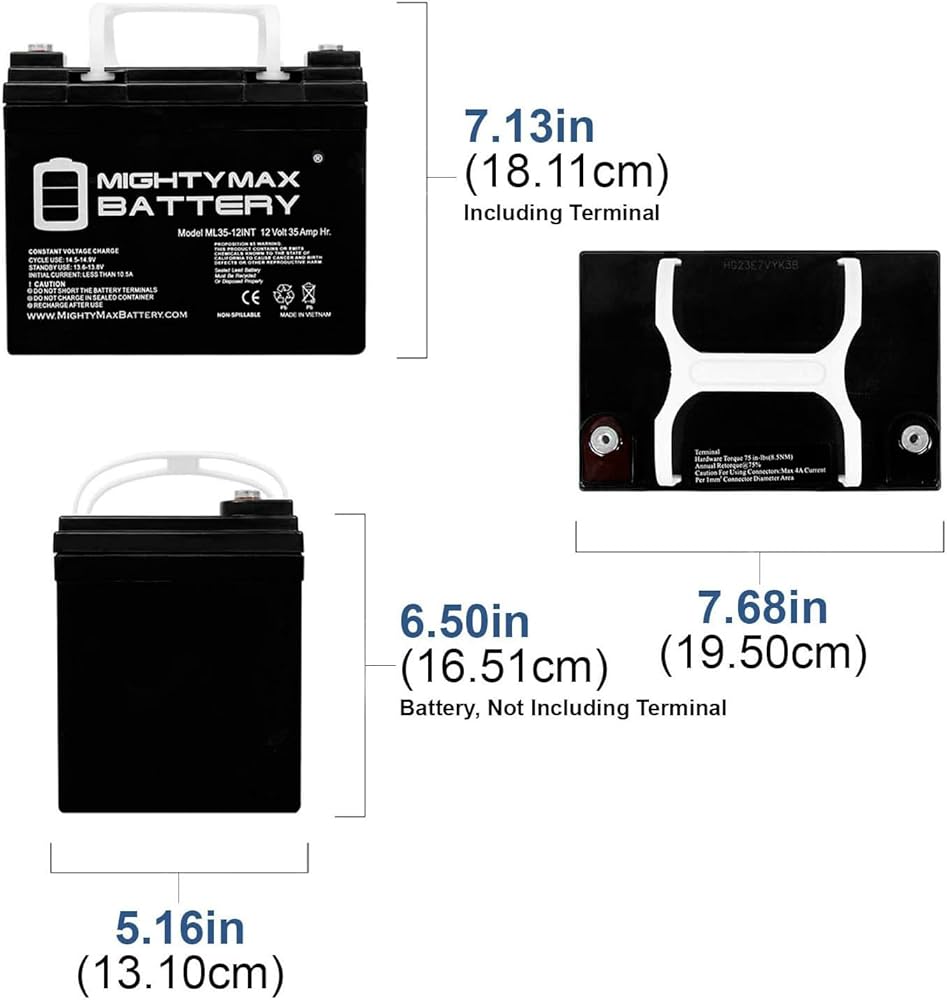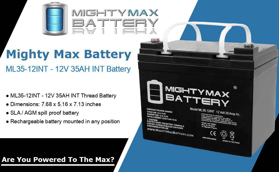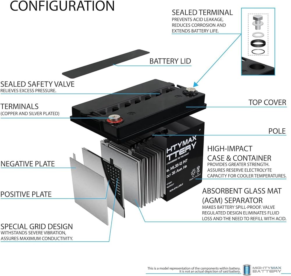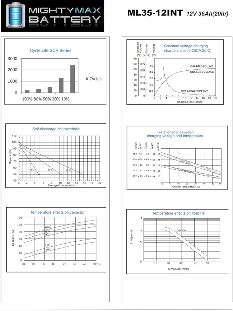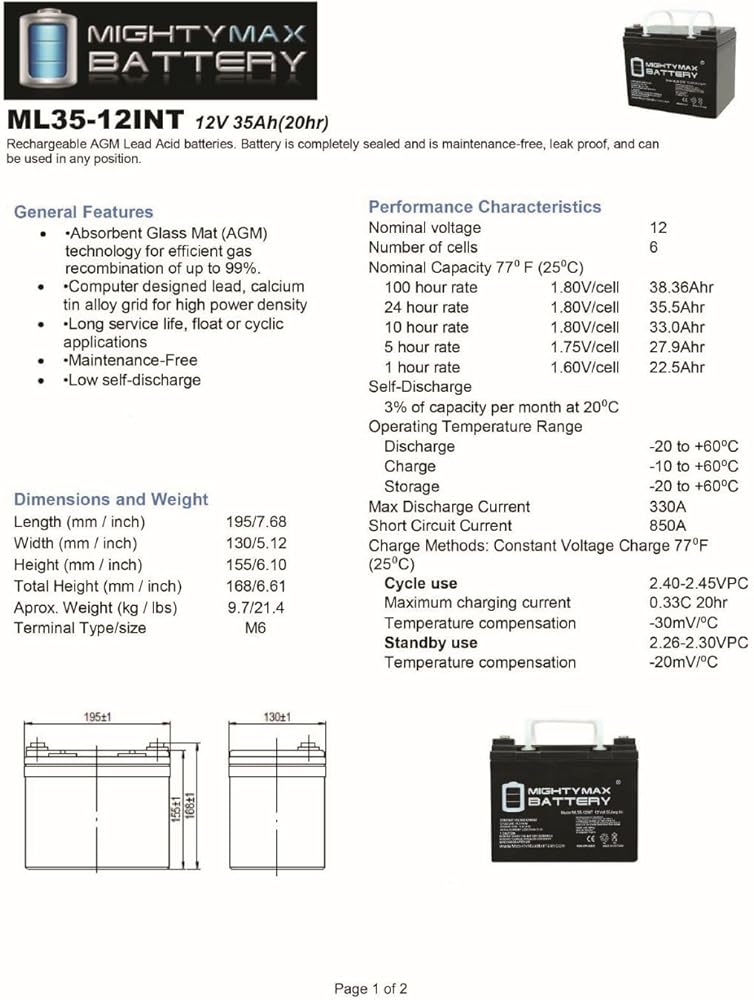 - الخيط الداخلي ML35-12 عبارة عن بطارية خالية من الصيانة قابلة لإعادة الشحن من حمض الرصاص المختوم (SLA) بقدرة 12 فولت 35 أمبير. عبوة من 2.