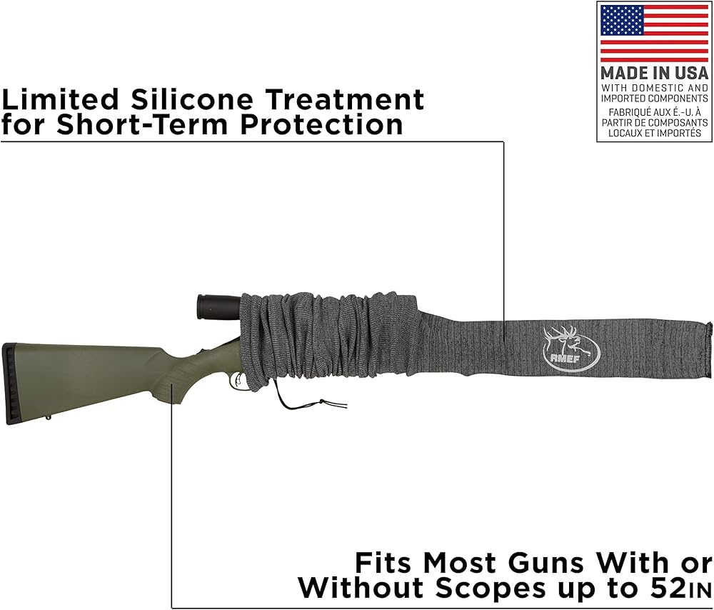 • VERSATILE GUN SOCK: A great addition to your gun accessories, this gun sock fits rifles and shotguns with or without scopes. It measures 52" and features a drawstring elastic closure.