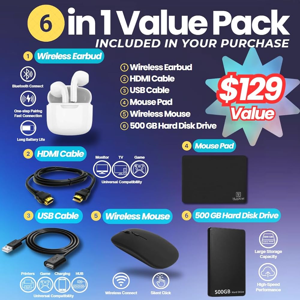 Accessory: HubxcelAccessory (Wireless earbus, USB extension cord, HDMI cable, mouse pad, wireless mouse, and 500GB external hard drive)