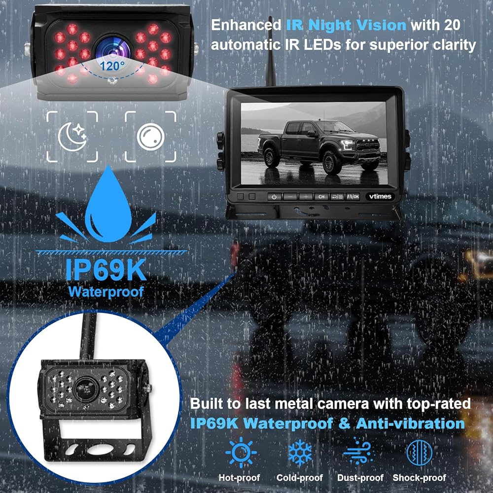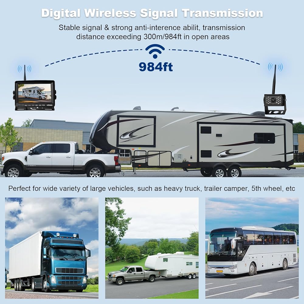 【إشارة لاسلكية قوية، بدون أسلاك】يلزم تعزيز سلامة قيادتك من خلال 3 كاميرات احتياطية لاسلكية RV مقاس 7 بوصة مصممة لسهولة التركيب بدون أسلاك. تتميز بتقنية مستشعر الصور CMOS المتقدمة مع نقل تشفير FM، مما يضمن فيديو واضح تمامًا دون انقطاع دون أي تأخير أو فقدان للإشارة، وأمن الخصوصية. مع نطاق إشارة قوي يصل إلى 984 قدمًا / 300 مترًا في المناطق المفتوحة وزاوية رؤية واسعة 120 درجة، يعد نظام الكاميرا الاحتياطية هذا مثاليًا للمركبات الترفيهية والشاحنات والمقطورات والتخييم.