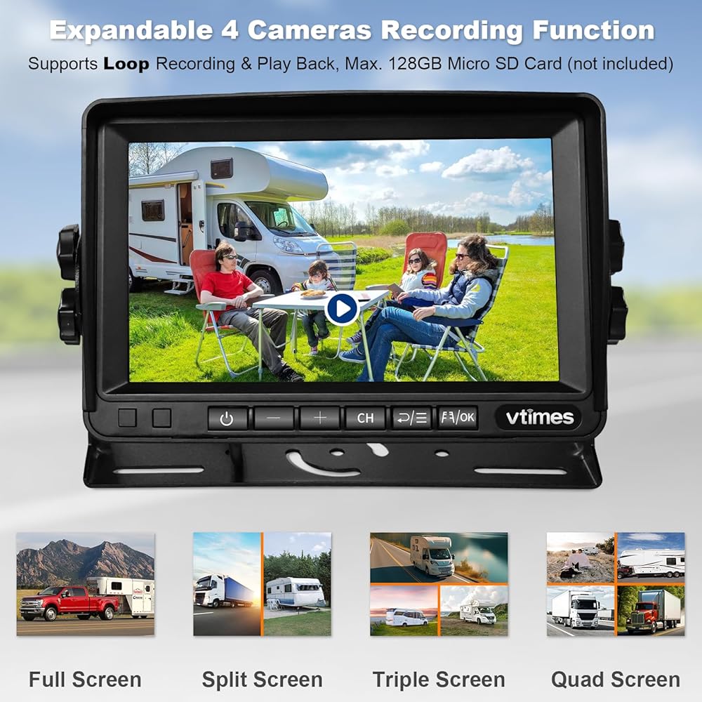 وظيفة التسجيل والتشغيل: يسمح نظام النسخ الاحتياطي اللاسلكي RV المكون من 3 كاميرات بالتسجيل والتشغيل المستمر. يمكنه تسجيل جميع قنوات الفيديو الأربع في وقت واحد، والتقاط رحلتك وتسجيل اللحظات المهمة. عندما تصل بطاقة التخزين إلى سعتها القصوى، يقوم النظام تلقائيًا بحذف أقدم اللقطات لإفساح المجال للتسجيلات الجديدة. يرجى ملاحظة: لا تتضمن العبوة بطاقة تخزين مدمجة. مطلوب بطاقة SD صغيرة (8 جيجابايت إلى 128 جيجابايت) لتنشيط هذه الميزة.
