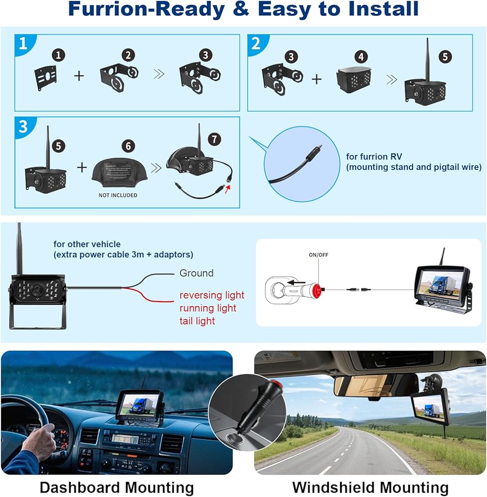 【سهولة التركيب مع كاميرا IP69K】من السهل جدًا تركيب الشاشة والكاميرا. تتصل شاشة الرجوع بولاعة السجائر، بينما يمكن توصيل الكاميرا الاحتياطية بالضوء الخلفي أو الضوء العكسي أو ضوء التشغيل للحصول على الطاقة. بالنسبة للمركبات الترفيهية المزودة بأنظمة Furrion المثبتة مسبقًا، تشتمل العبوة على دعامة تثبيت لتركيب الكاميرا وسلك ضفيرة لسهولة التوصيل. الكاميرا الاحتياطية RV المعدنية بالكامل مقاومة للماء والصدمات IP69K، ومصممة للعمل في الظروف الجوية القاسية.