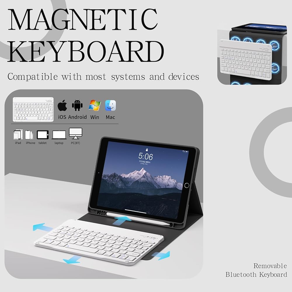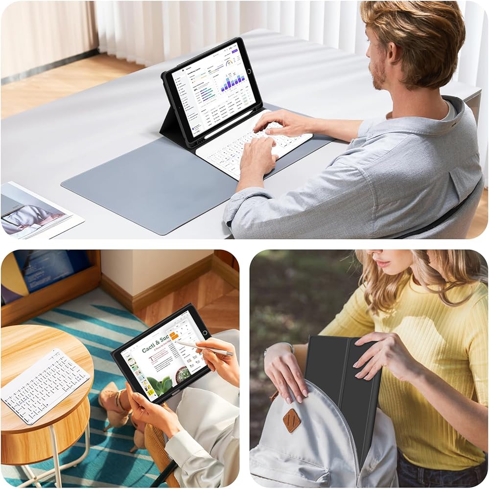 【لوحة مفاتيح بلوتوث لاسلكية】لوحة مفاتيح iPad 9th/8th/7th مقاس 10.2 بوصة سهلة وسريعة ومستقرة للاتصال عبر البلوتوث، وإعادة الاتصال على الفور عند تشغيلها. لوحة مفاتيح iPad الجيل التاسع هذه مصحوبة بمفاتيح اختصار متعددة الوظائف، يمكنها دعم اتصالات الأجهزة المختلفة والاستخدام والتبديل