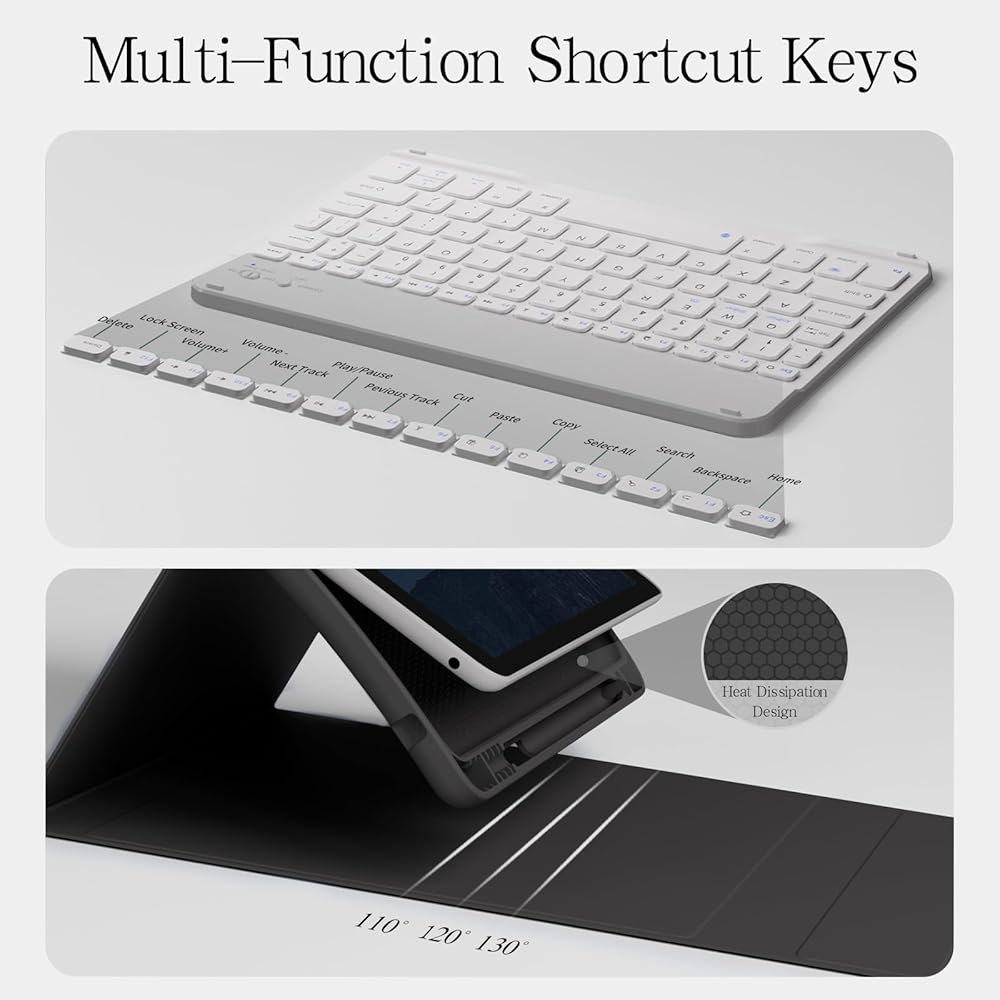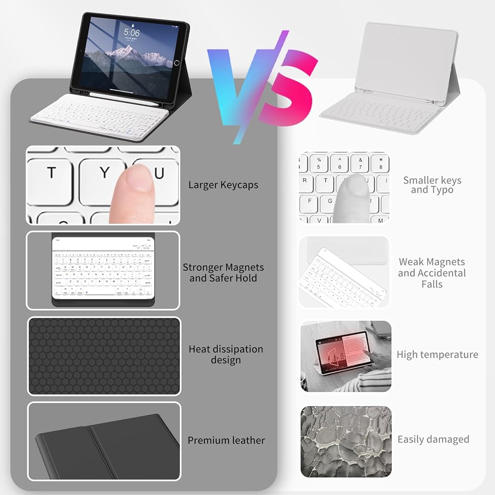 【حماية شاملة】حافظة لوحة مفاتيح iPad الخاصة بنا لجهاز iPad الجيل 9/8/7 مقاس 10.2 بوصة مصنوعة من مواد عالية الجودة بسمك متزايد، وتحمي جهازك بشكل فعال من التأثيرات والخدوش اليومية. وتوفر الطبقة الداخلية وسادة بنمط شبكي يمكنها إطلاق حرارة تزيد عن 80% مقارنة بحافظات iPad، مما يحمي جهاز iPad الخاص بك من الحرارة الزائدة ويطيل العمر الافتراضي.