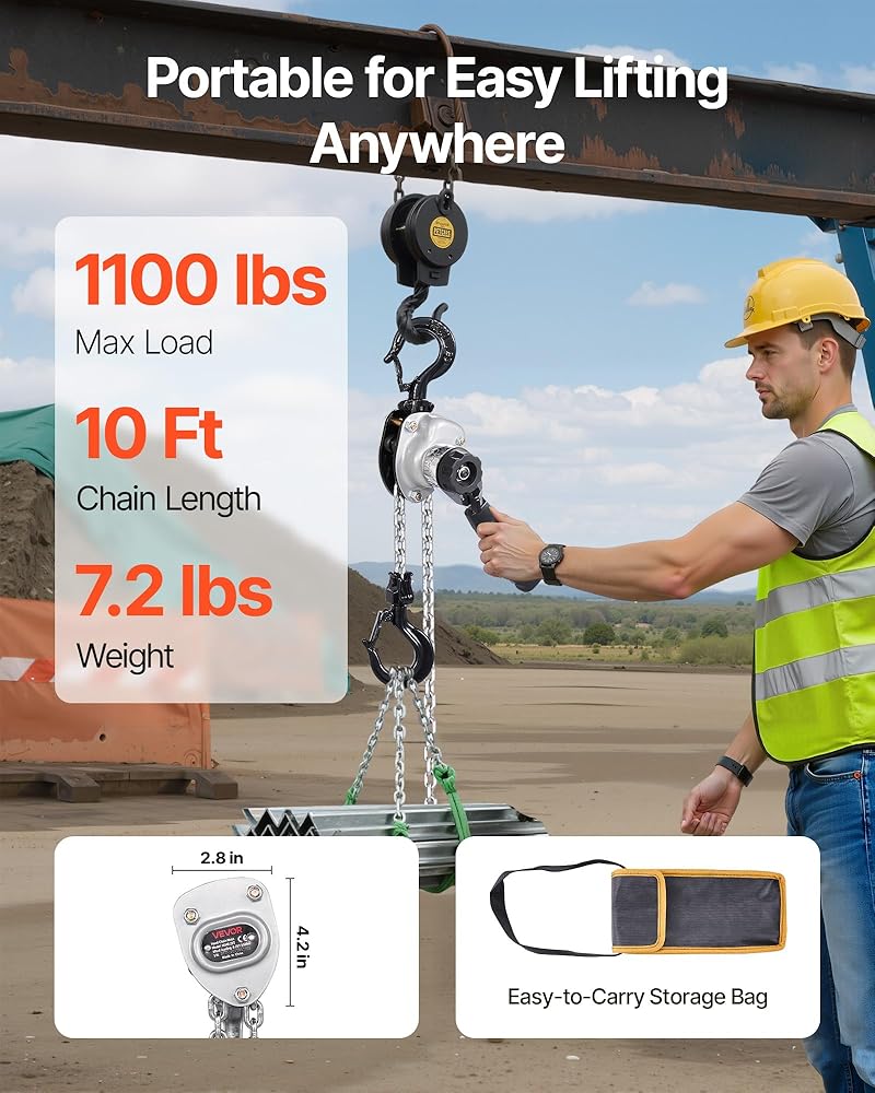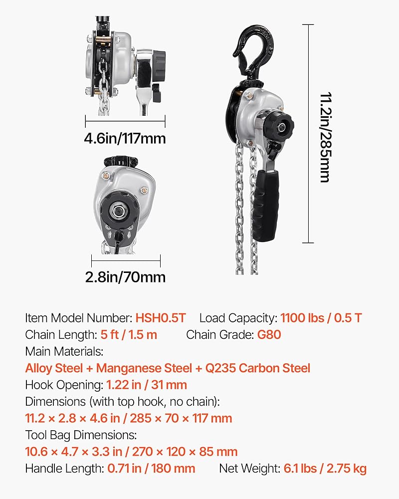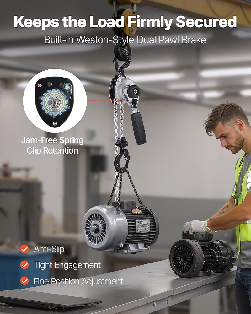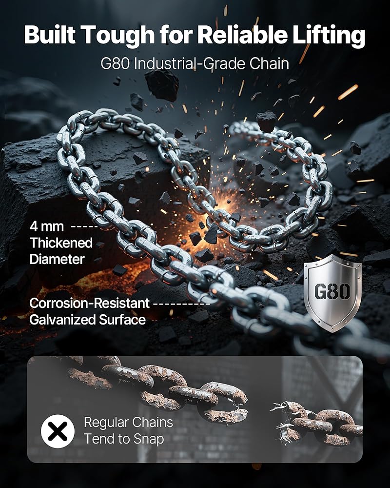 سهلة التركيب: يمكن تعليقها مباشرة على السقف باستخدام شرائح معدنية أو خشبية صلبة. علاوة على ذلك، فهي مجهزة بمفتاح إيقاف الطوارئ ونظام الكبح الكهرومغناطيسي لتجنب الانزلاق غير الطبيعي. يأتي مع حزام رفع بطول 13 قدم وحزام عمود بطول 3.2 قدم مع حلقة معدنية.