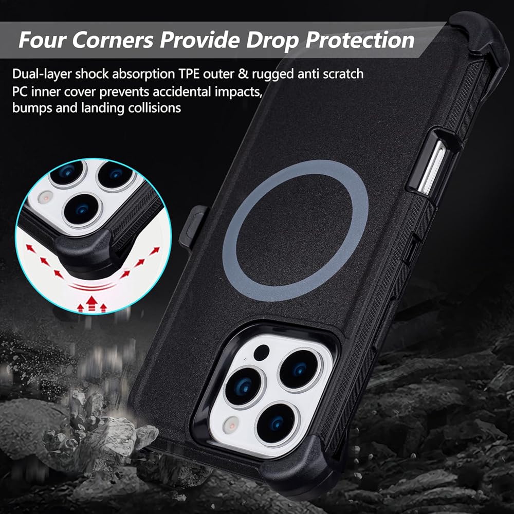 حماية من السقوط من الدرجة العسكرية: تم اعتماد هذه الحافظة شديدة التحمل لهاتف iPhone 16 Pro Max 999 مرة من اختبارات السقوط من ارتفاع 8 أقدام. هيكل من 3 طبقات، طبقة خارجية من مادة TPU ممتصة للصدمات وغطاء داخلي متين مضاد للخدش من البولي كربونات، يحمي هاتفك من السقوط العرضي والصدمات والخدوش