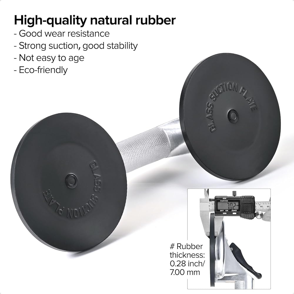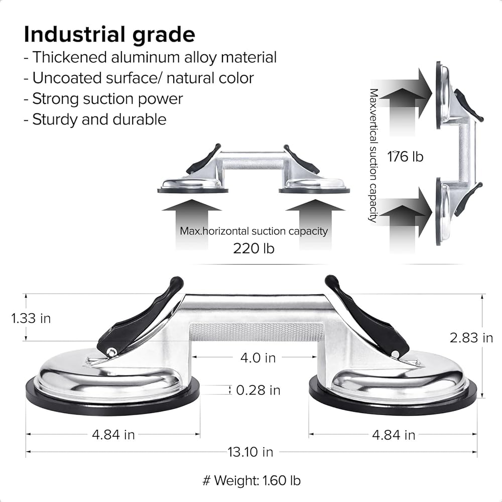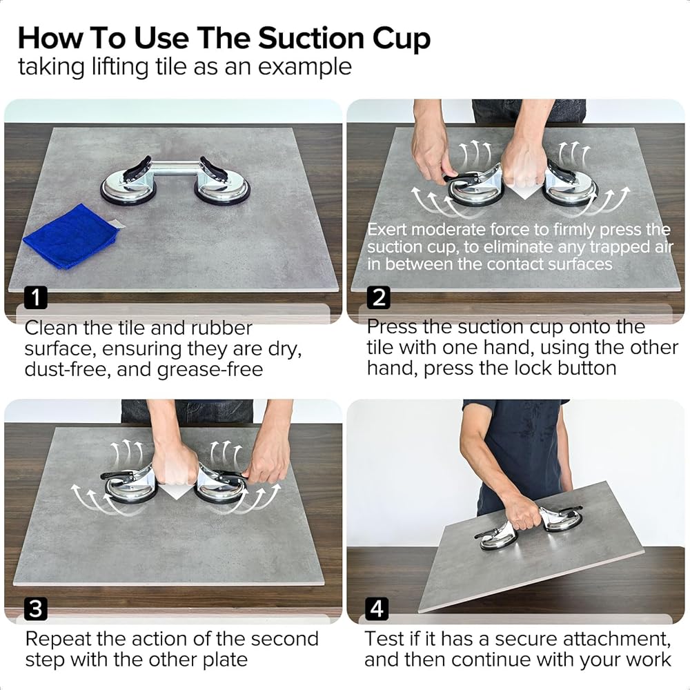 [شفط قوي] يوفر رافع البلاط الزجاجي لدينا قوة شفط قوية وطويلة الأمد لتلبية احتياجاتك. يمكن لكوب الشفط أن يحمل الحد الأقصى. وزن 220 رطل، يرجى عدم تجاوز الحد الأقصى لوزنه. يرجى التأكد من أن سطح الجسم أملس ونظيف وجاف بدون أي ثقوب. من المهم أيضًا تنظيف سطح وسادة الشفط.