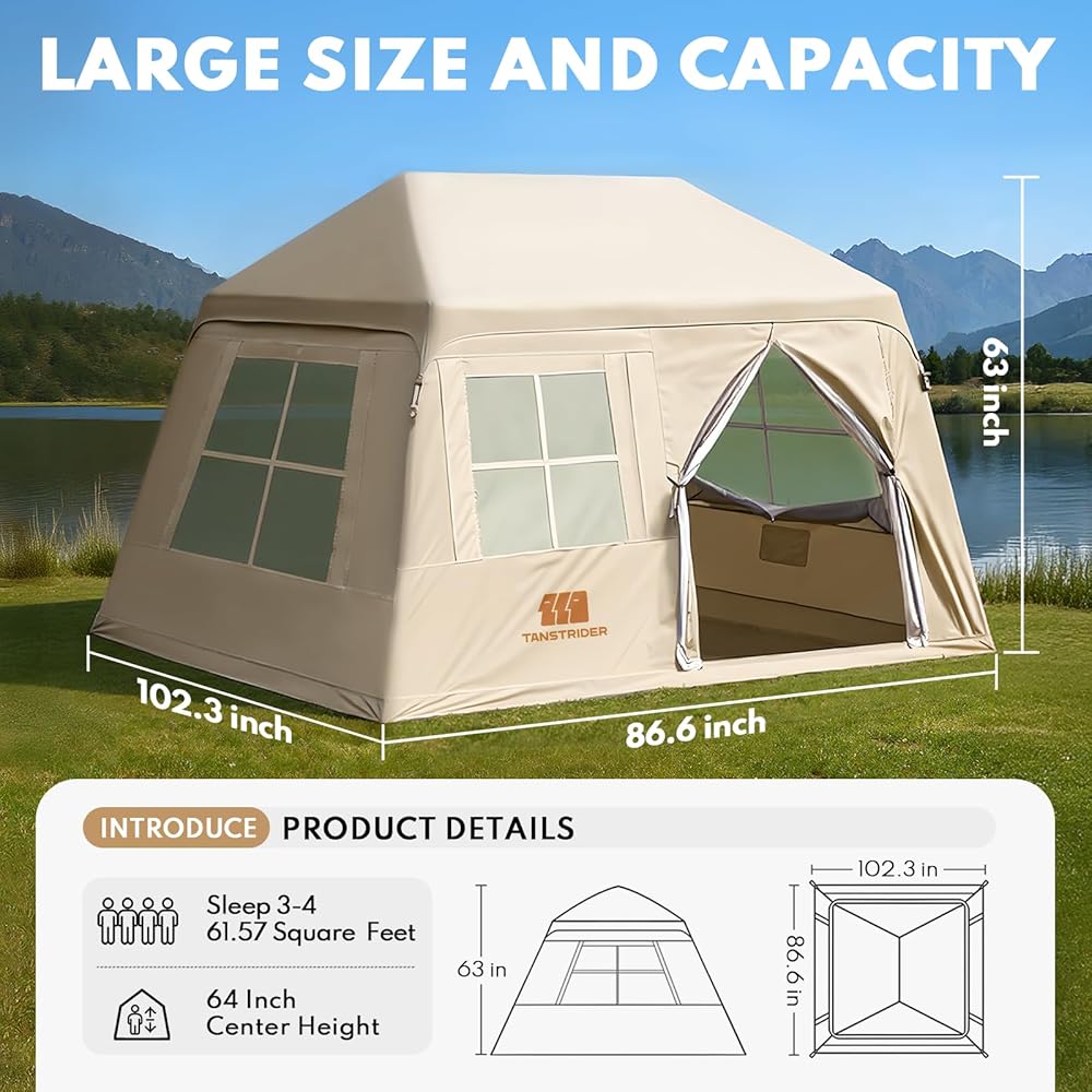 【SPACIOUS AND COMFORTABLE】:This pump up tent measures 102.4x86.6x63 inches when unfolded and can easily accommodate 3-4 people without feeling cramped. We also provide an easy-to-carry storage bag with storage dimensions of 28.7x12.6x12 inches and a weight of 23 pounds, designed for family camping.