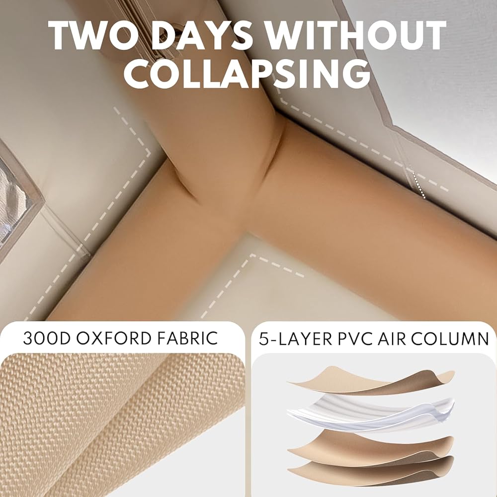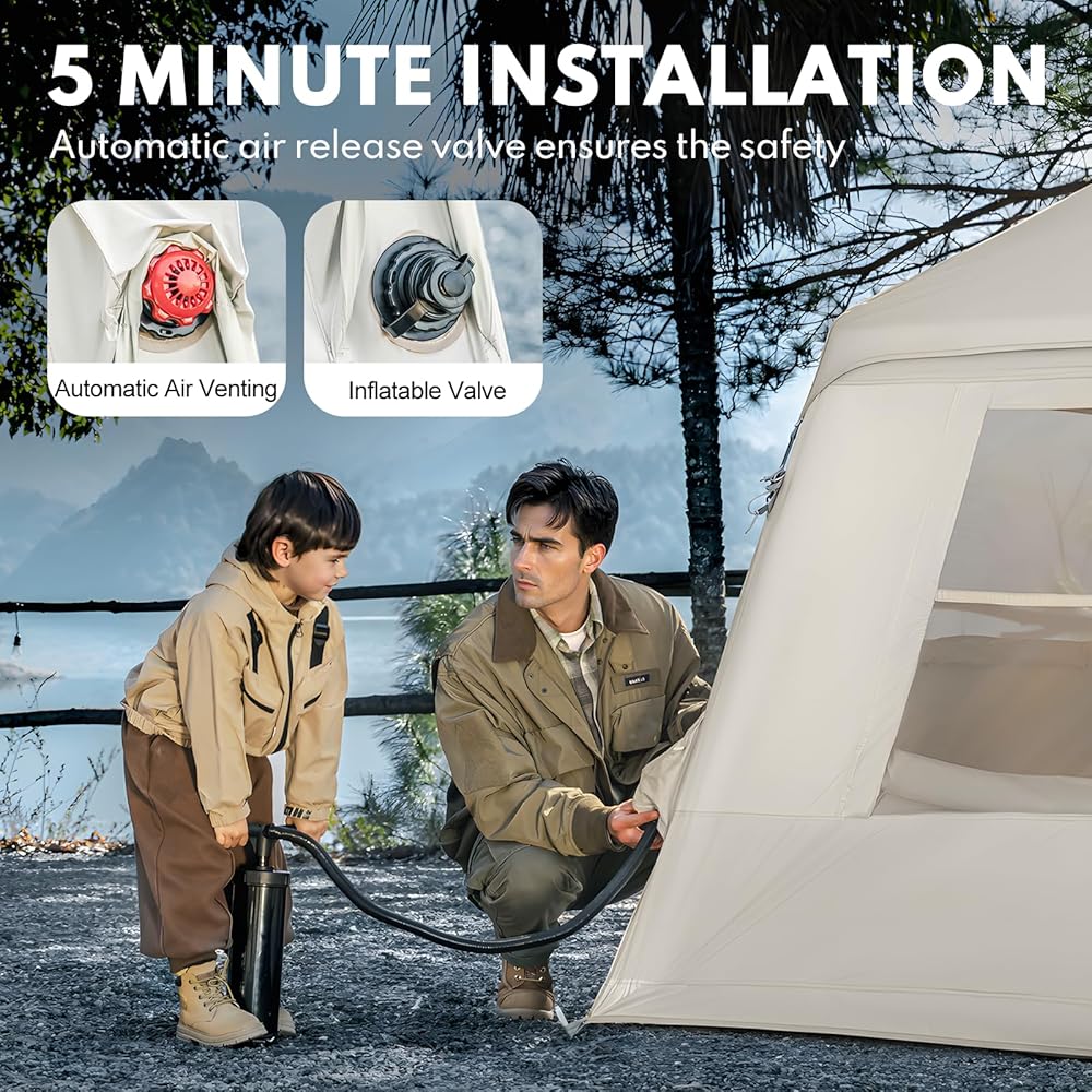 【EFFORTLESS SETUP】:Unlike traditional bulky metal poles, the support poles of this inflatable camping tent have an integrated design that can be quickly molded, eliminating the need to manually set them up, and can be inflated in less than 5 minutes with a manual pump with a protective cover to prevent the poles from being punctured or torn.