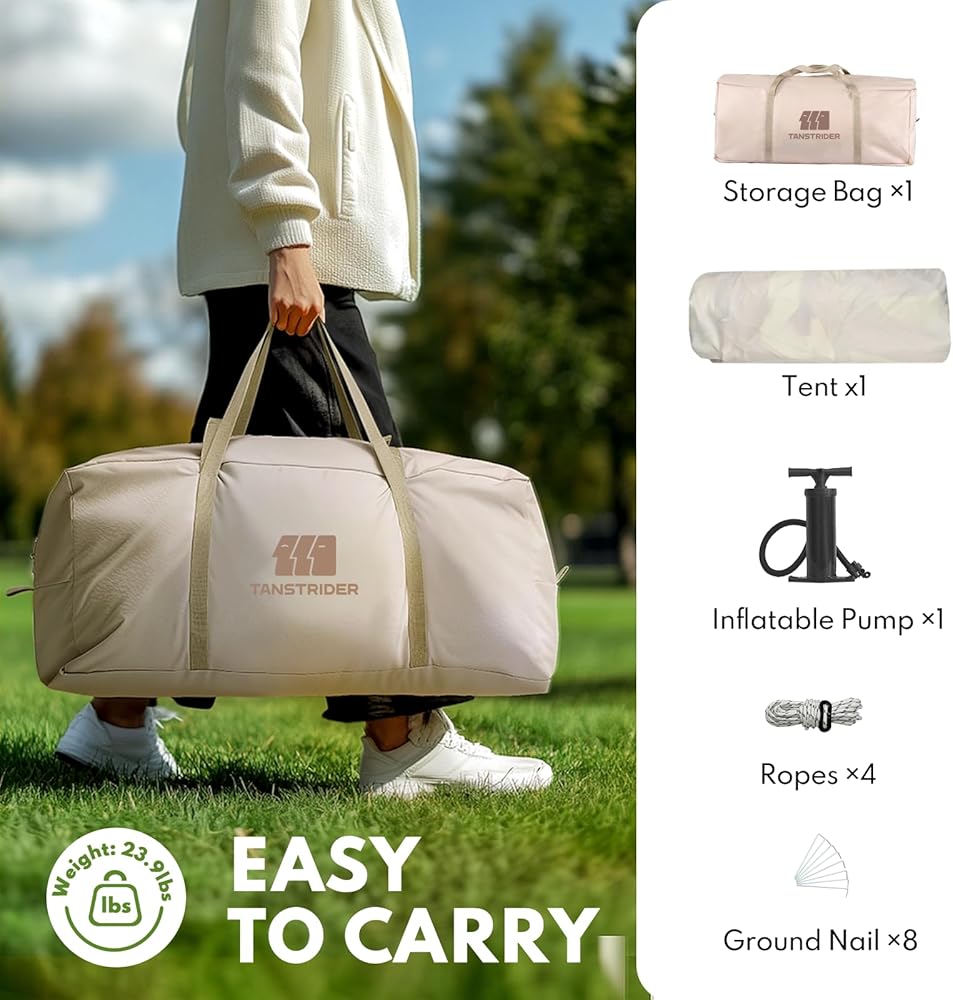 Note:TANSTRIDER inflatable tents are not recommended for use in adverse conditions such as prolonged heavy rain or snowstorms.And when stored, it will get mouldy and damaged if it is in a humid environment and needs to be kept dry before storage.