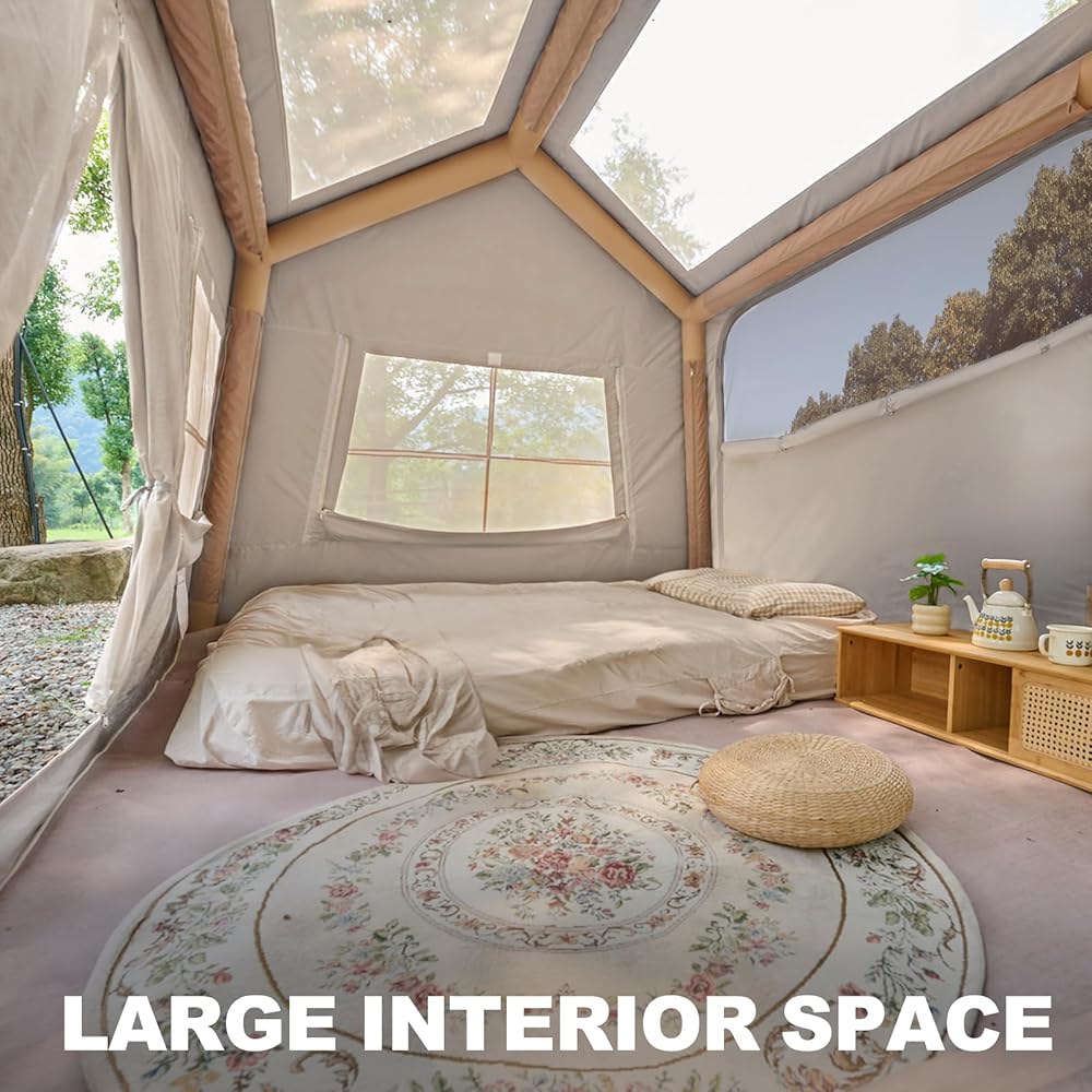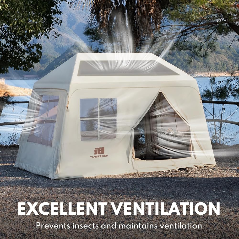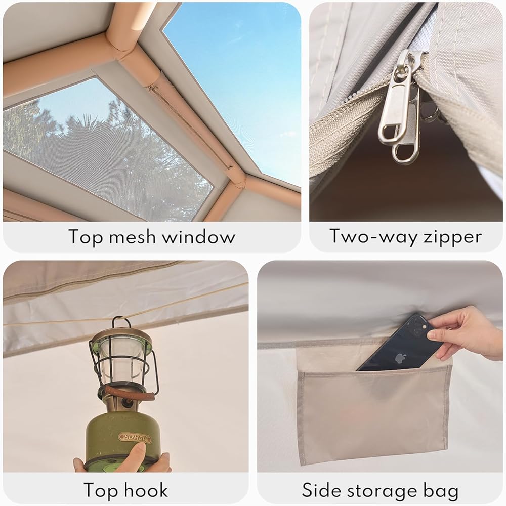 【EXCELLENT VENTILATION】:This blow up tent is meticulously designed with two oversized skylights to increase the brightness inside the air tent. There are also two doors for easy access, and both the doors and windows are equipped with high-density mesh screens.