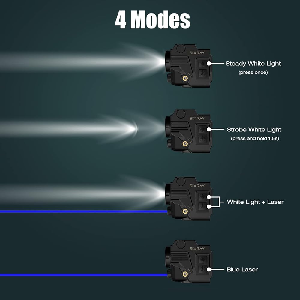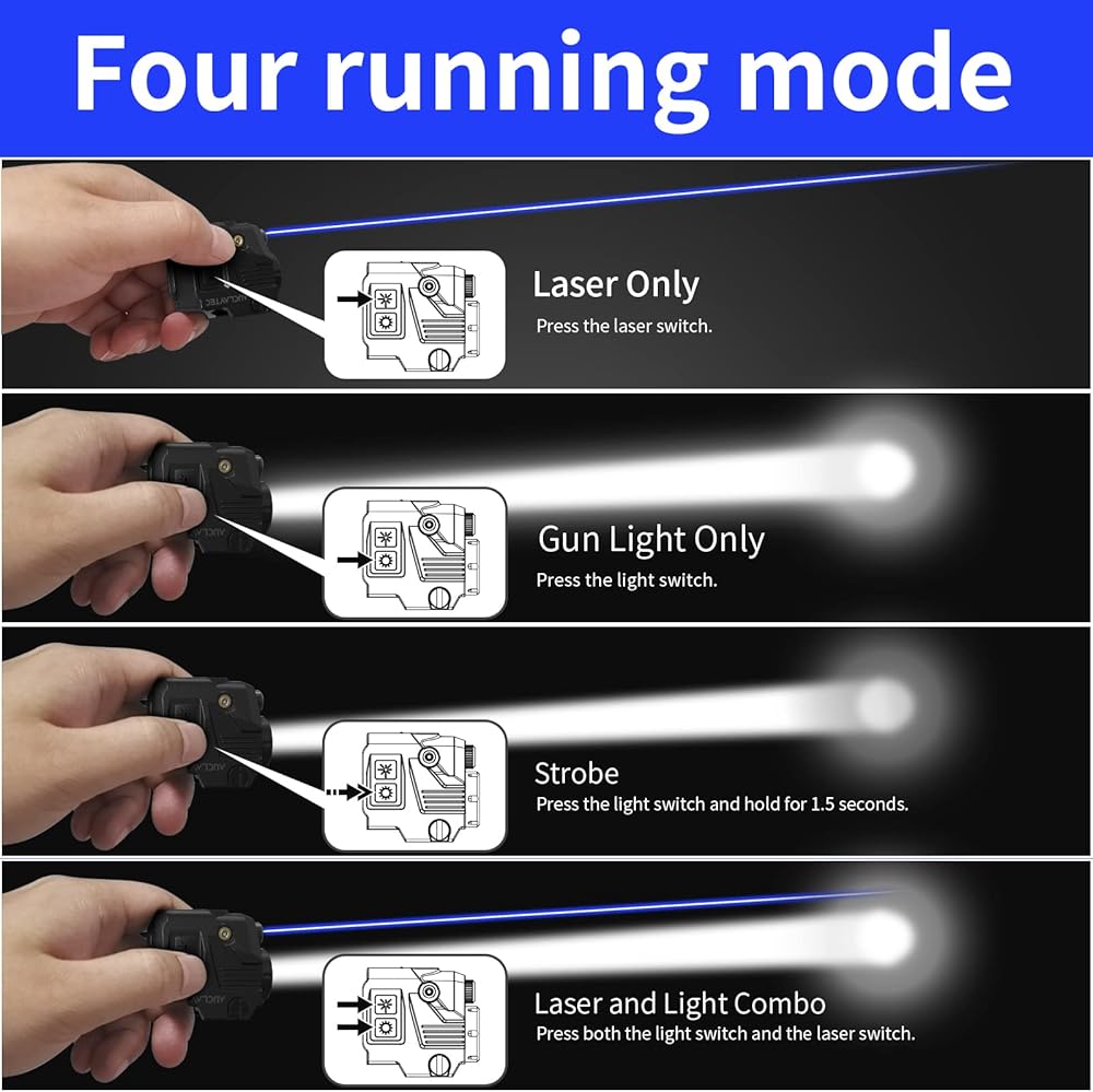أوضاع الإضاءة المرنة: تجمع بين مخرجات الضوء بناءً على متطلباتك، ويمكن استخدامها مع الليزر الأخضر فقط، أو المصباح اليدوي فقط، كل من الليزر والمصباح اليدوي، ومصباح يدوي، ومصباح ليزر ومصباح يدوي.