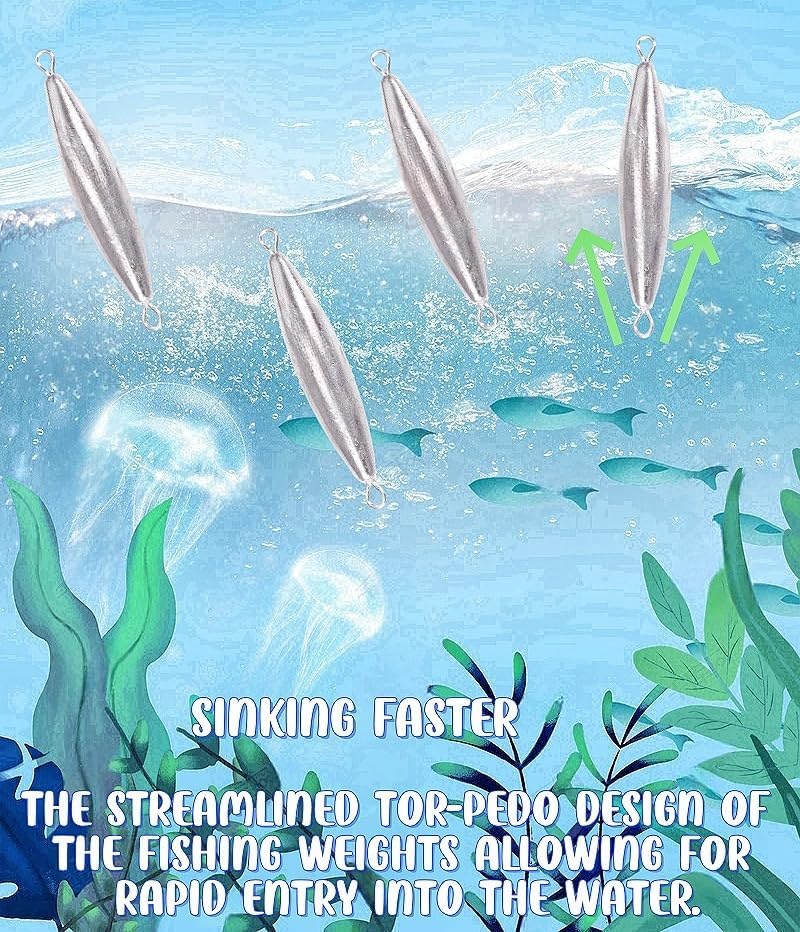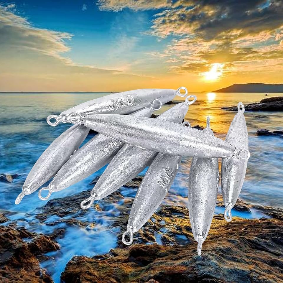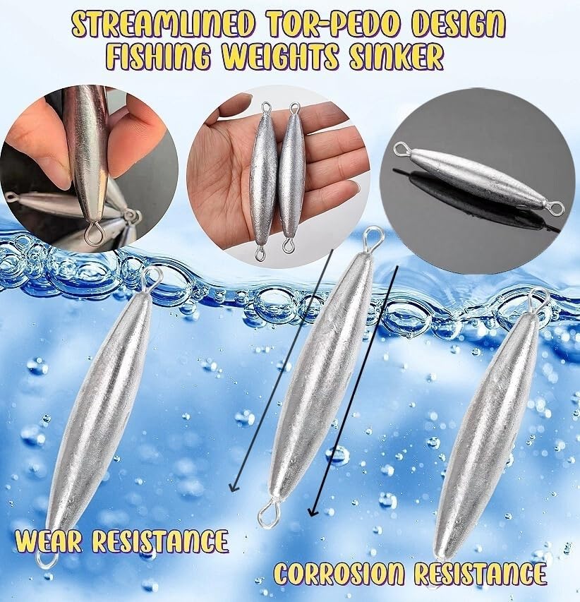 The streamlined tor-pedo design of the fishing weights allowing for rapid entry into the water.With minimal resistance while gliding underwater, these sinkers can efficiently and silently present bait to larger fish. Additionally, fishing weights minimize disruption to your bait's swimming motion, enhancing your chances of attracting and hooking fish effectively.
