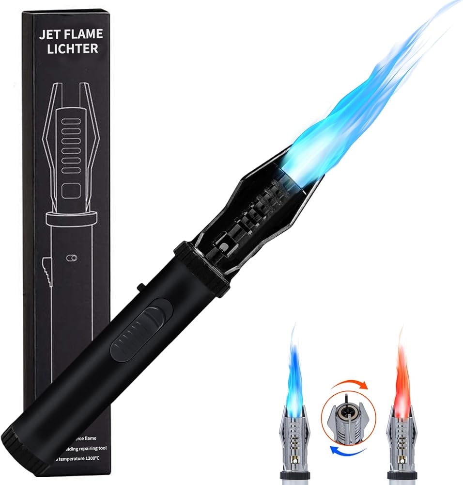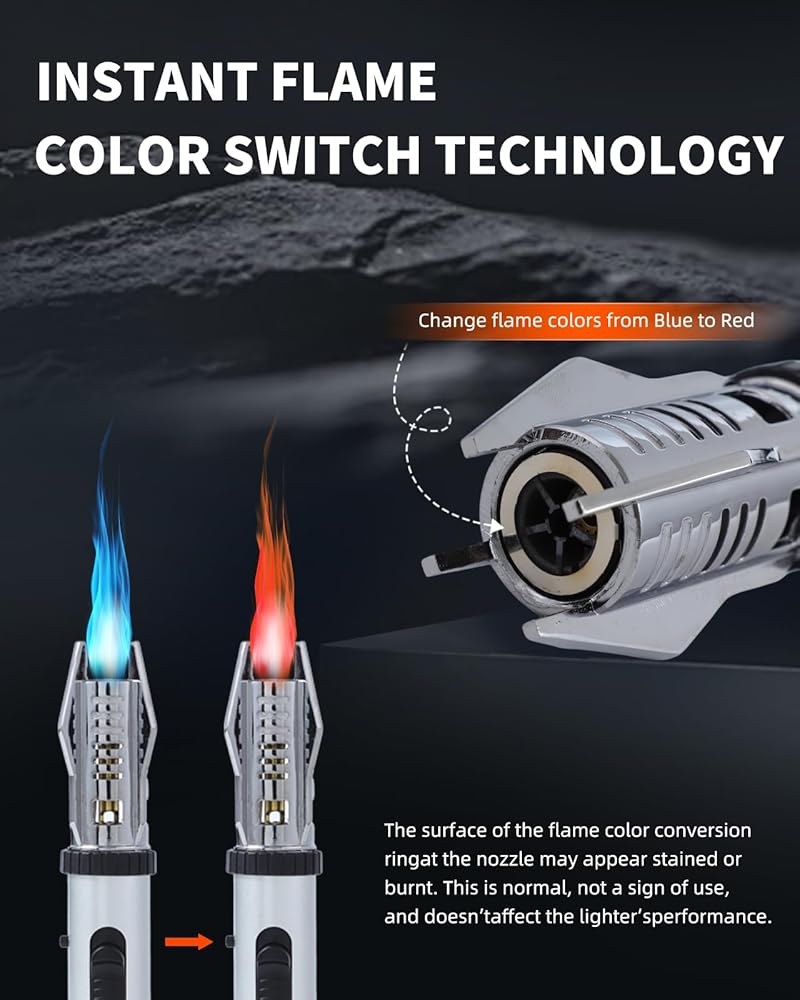 【عرض تقنية تحويل الألوان الفريدة】تتميز ولاعة شعلة البيوتان الخاصة بنا بحلقة تحويل الألوان المبتكرة في الفوهة، مما يسمح لك بتغيير اللهب بسهولة من الأزرق إلى الأحمر. تضيف هذه التقنية الحصرية لمسة مميزة إلى تجربة الطبخ أو الشوي أو الصناعة اليدوية.