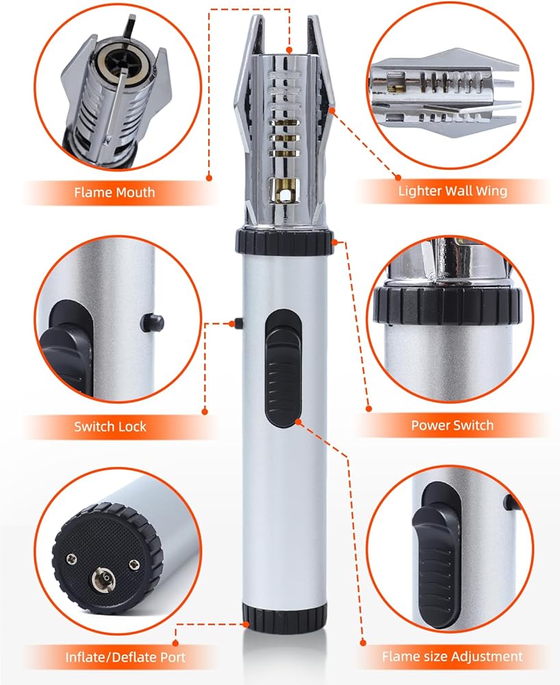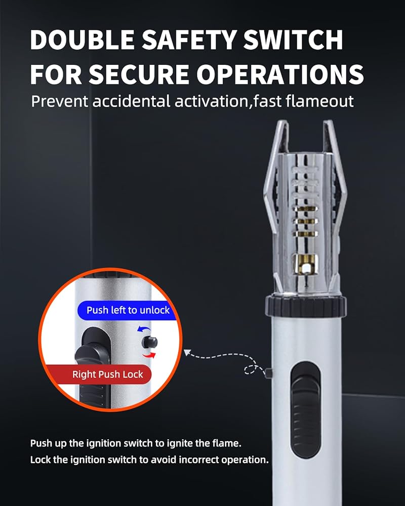 【لهب قابل لإعادة الملء وقابل للتعديل】ولاعة شعلة البيوتان الخاصة بنا قابلة لإعادة الملء، مما يسمح لك بتجديد الغاز بسهولة عند الحاجة. اضبط ارتفاع اللهب عبر عجلة الوقود: (+) للزيادة، (-) للنقصان. يتميز بقفل أمان لمنع الاشتعال العرضي وسوء الاستخدام من قبل الأطفال، مما يضمن أداءً آمنًا وموثوقًا. مثالية للطهي والشواء والحرفية. (غاز البوتان غير متضمن بسبب لوائح الشحن.)