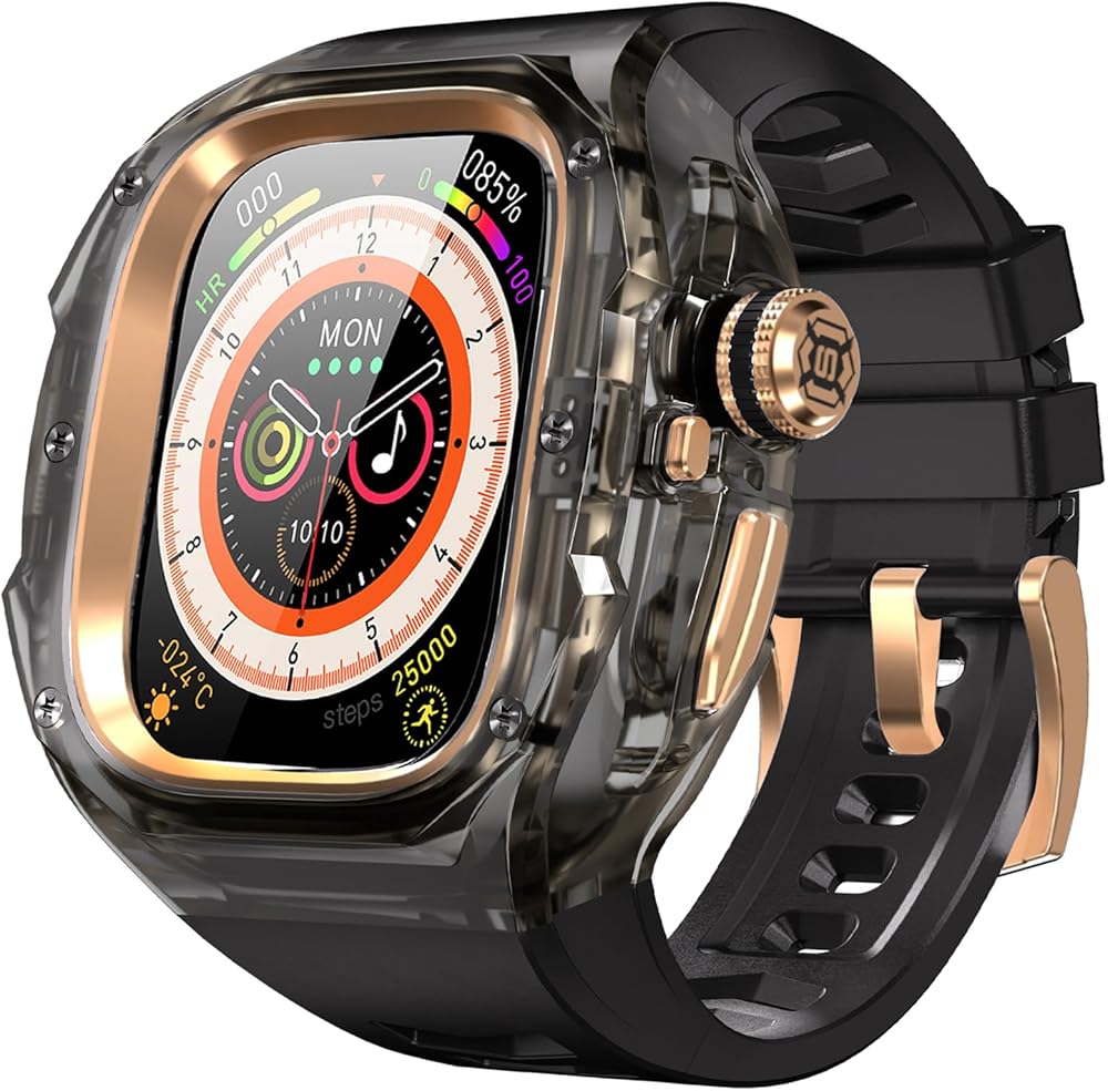 تصميم أنيق المظهر: تمزج علبة الساعة مقاس 49 ملم بين الملمس والوضوح للحصول على مظهر عصري. تتميز مادة الكمبيوتر الخاصة بها بجزء أمامي/خلفي غير لامع ممتاز (مقاوم لبصمات الأصابع) وجوانب شفافة لإبقاء التصميم الأصلي لساعتك مرئيًا. يضيف الإطار الأوسط الأنيق المصنوع من سبائك الألومنيوم، المقترن بأزرار مصنوعة من خليط معدني متطابق، لمسة متماسكة وراقية. والأفضل من ذلك، أنه خفيف الوزن بشكل مدهش - لا يوجد عبء إضافي للاستخدام اليومي - مما يجعله مثاليًا للارتداء طوال اليوم ويوازن بين الموضة الأنيقة والوظيفة العملية.