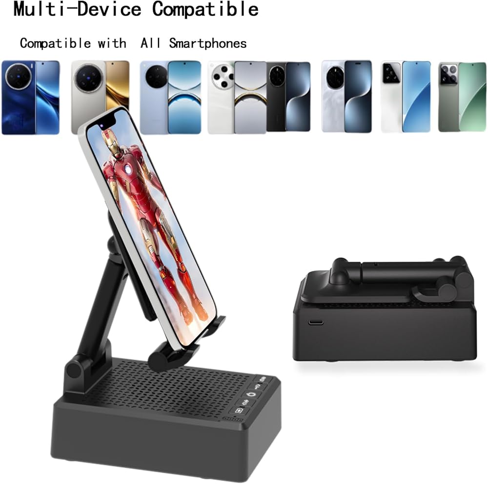 مكبر صوت بلوتوث 3 في 1 + حامل هاتف + ميكروفون - يوفر مكبر صوت بلوتوث لاسلكي مطور صوتًا واضحًا وعاليًا للموسيقى والأفلام ومقاطع الفيديو والبودكاست. بفضل الميكروفون المدمج، يضمن إجراء مكالمات واضحة بدون استخدام اليدين ويساعد الأشخاص الذين يعانون من فقدان السمع على السمع بشكل أكثر وضوحًا. (يرجى ملاحظة: إنه ليس حامل شحن.)