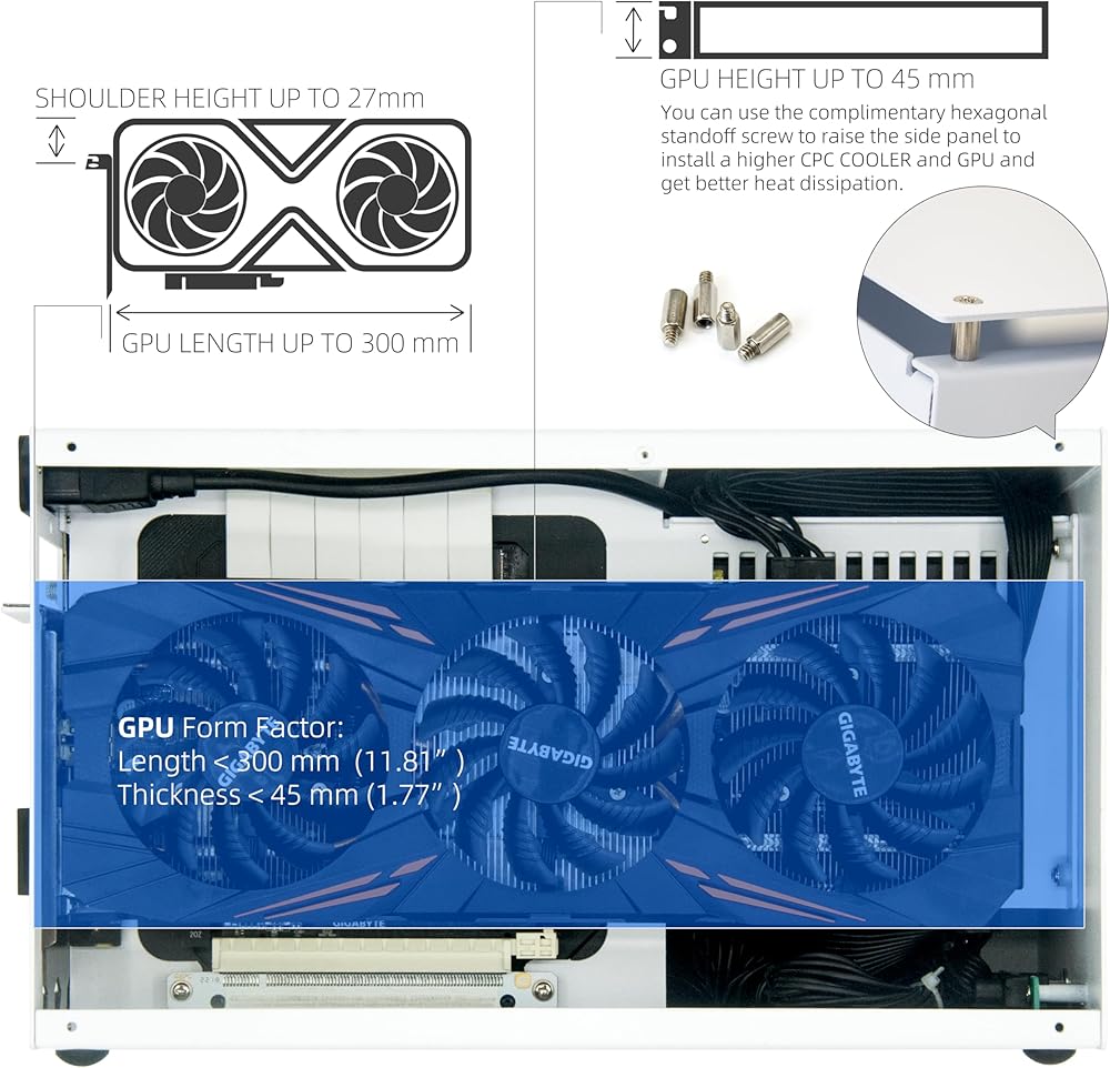 توافق وحدة معالجة الرسومات: يدعم K49 White Wide وحدات معالجة الرسومات التي يصل طولها إلى 300 مم (11.81 بوصة) وارتفاعها 60 مم (2.36 بوصة). يقتصر ارتفاع كتف وحدة معالجة الرسومات على 27 ملم (1.06 بوصة). يلزم وجود كابل إضافي مزدوج التوصيل بطول 18.5 سم للتثبيت.