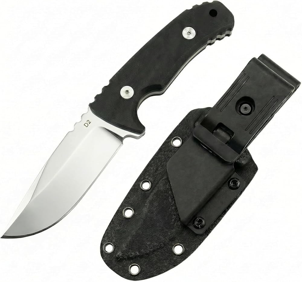 سكين ذو نصل ثابت مع غمد، 3.9 بوصة D2 سكاكين نجاة فولاذية للتخييم، صناعة الأدغال، مقبض مريح G10 هدية معدات النجاة الخارجية للرجال، أسود