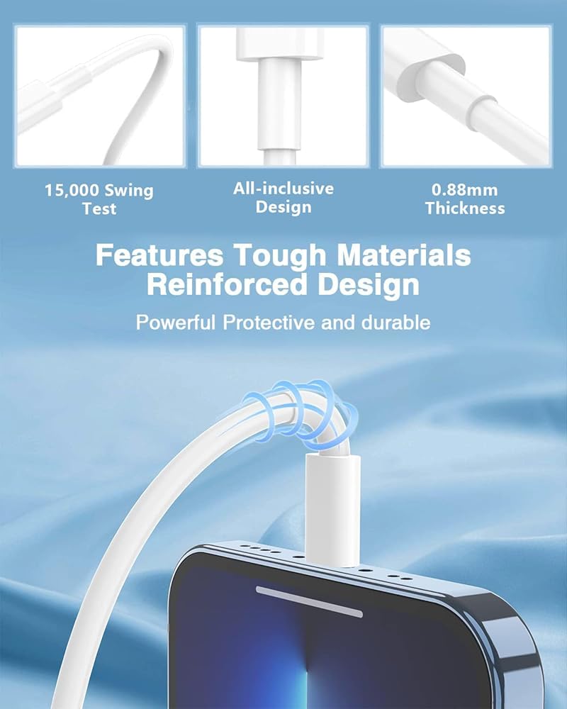 كابلات شحن iPhone هذه مصنوعة من مواد فاخرة ومغطاة بمادة TPE، والتي تدوم لفترة أطول بكثير من أسلاك شاحن iPhone الأخرى وثبت أنها تتحمل أكثر من 15000 انحناء في الاختبارات المعملية الصارمة.