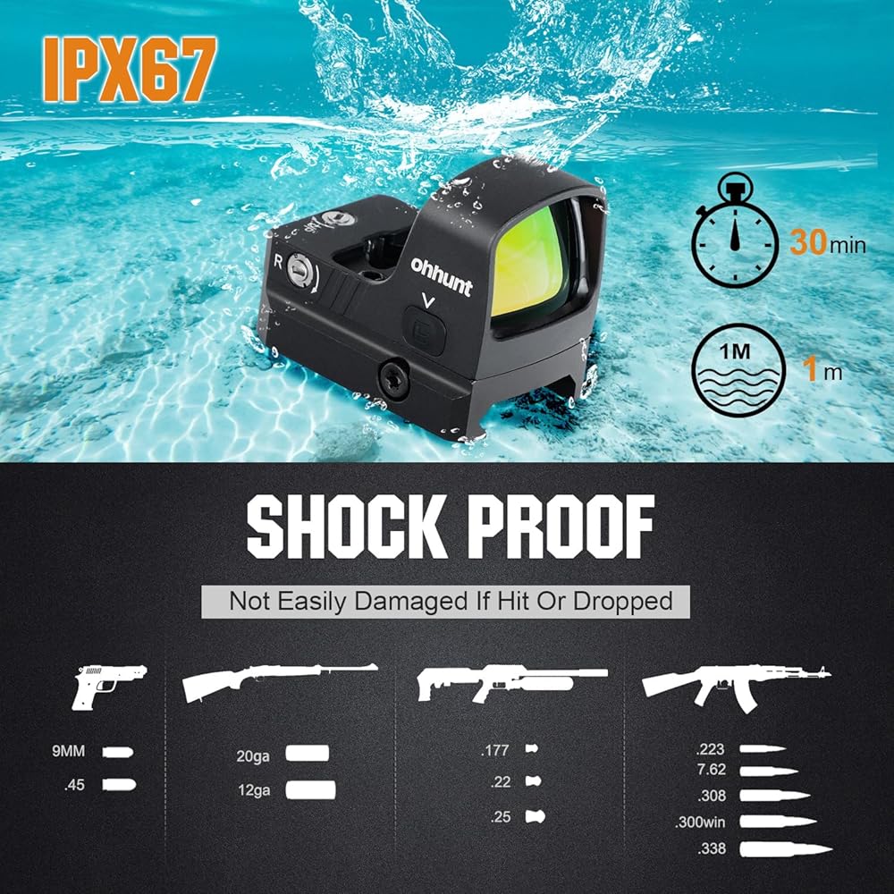 • 【المواصفات: النقطة الحمراء مصنوعة من غلاف ألومنيوم CNC، معيار 6061-T6. مقاوم للصدمات بقوة 1000 جرام، ومقاوم للماء بمعيار IpX67 حتى عمق 1 متر لمدة 30 دقيقة.
