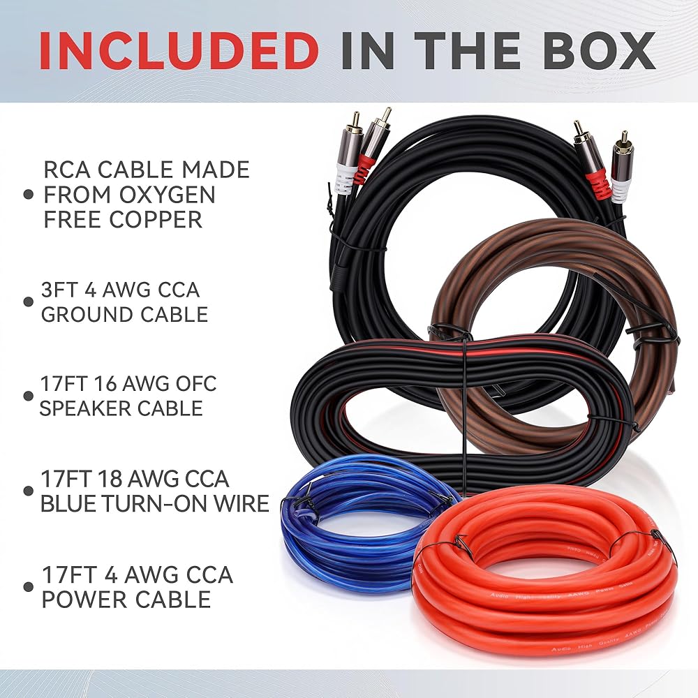 • 【High-Quality Cable Kit】Includes a 17ft 0AWG power cable and 3ft 0AWG ground cable with high-purity CCA core and transparent PVC jacket for high-current transmission and reduced loss. The 17ft 2RCA audio cable features double-layer shielding and OFC core for high-fidelity sound. A 17ft 16-gauge OFC speaker wire offers clear polarity marking, plus a 17ft 18AWG blue remote turn-on cable for synchronized amplifier power control. Delivers clean, stable signal and power to your audio system.