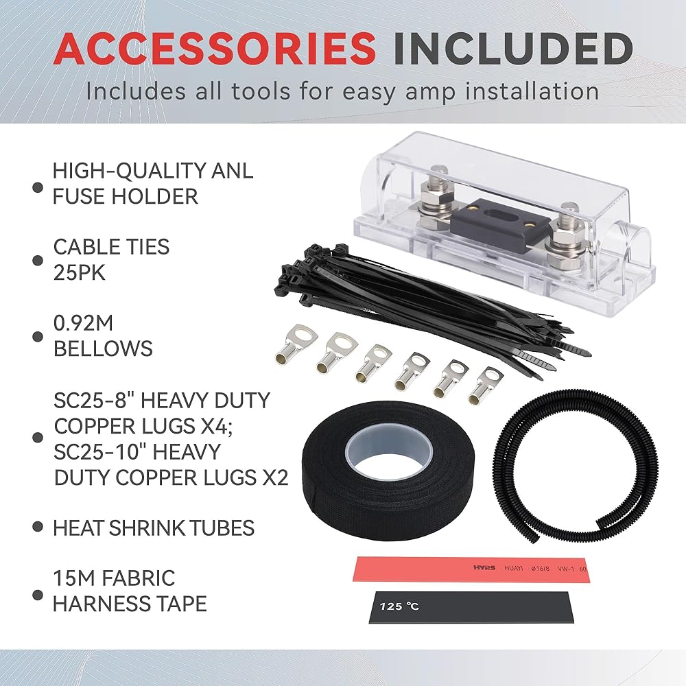 • 【Easy to Install】This 1/0 Gauge Complete Amp Wiring Kit includes all needed components with clear color-coding and labeling to prevent errors. Highly flexible wires bend easily even in tight spaces, simplifying routing. No special tools are required—whether you're a beginner or DIY enthusiast, you can achieve a professional setup and enjoy a satisfying installation experience.