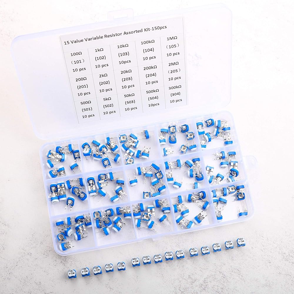 تشتمل المجموعة على 15 قيمة مقاومة متغيرة و10 قطع لكل قيمة، إجمالي 150 قطعة. مجموعة واسعة من القيم تسمح لك بالحصول على المقاومة التي تحتاجها بالضبط.