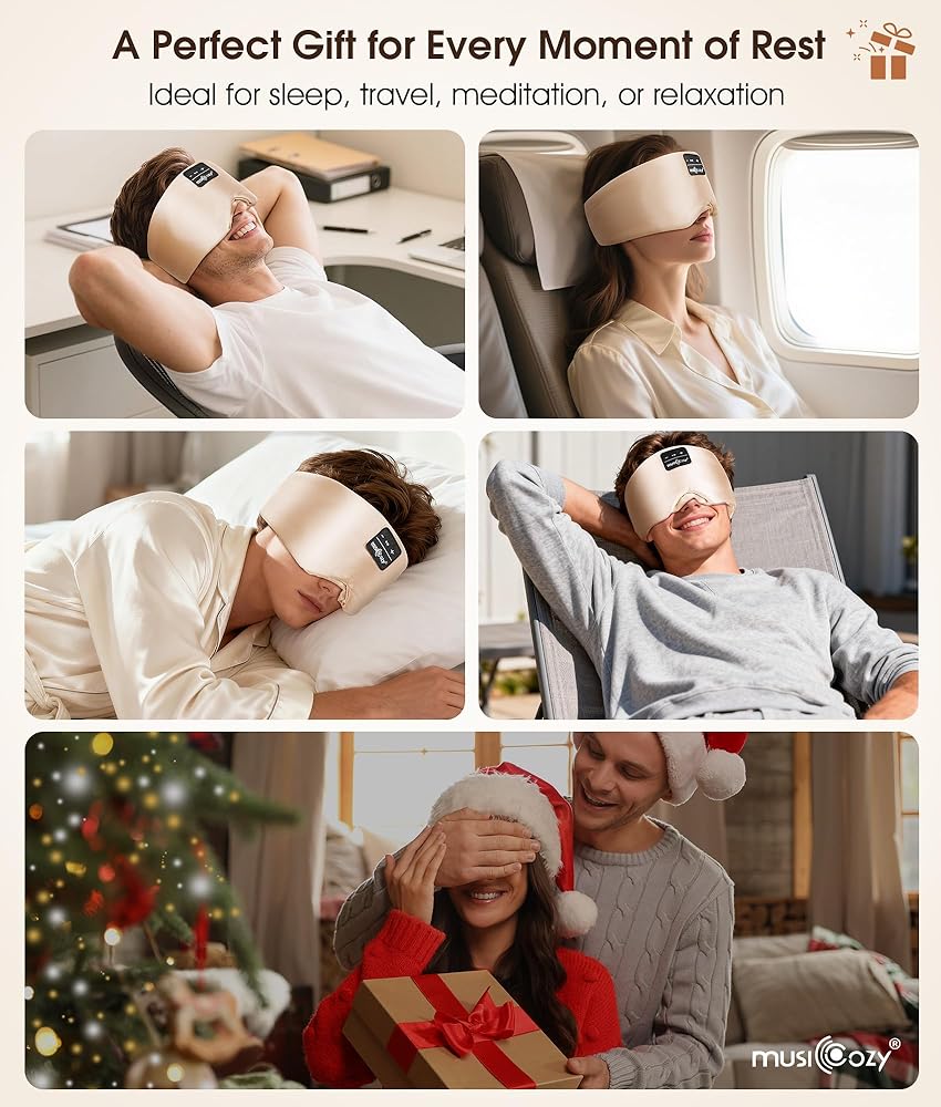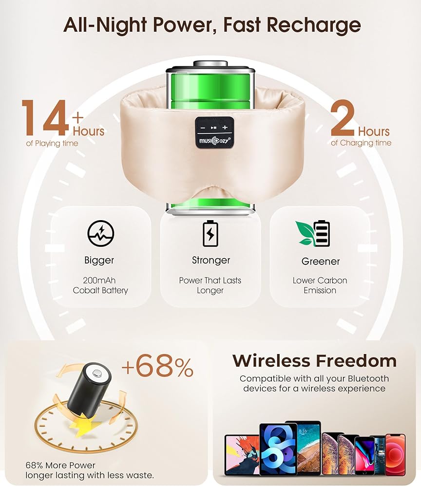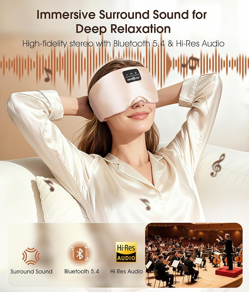 📶 اتصال بلوتوث 5.4 مستقر وشحن USB-C - استمتع بالاقتران السريع والاتصال اللاسلكي الموثوق به للاستماع دون انقطاع. مع شحن USB-C ووقت شحن كامل لمدة ساعتين، فإن قناع العين البلوتوث هذا سهل الاستخدام في المنزل أو أثناء السفر.