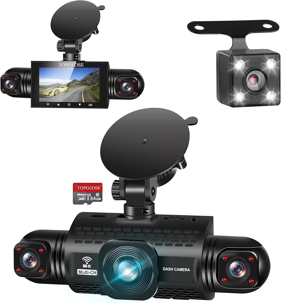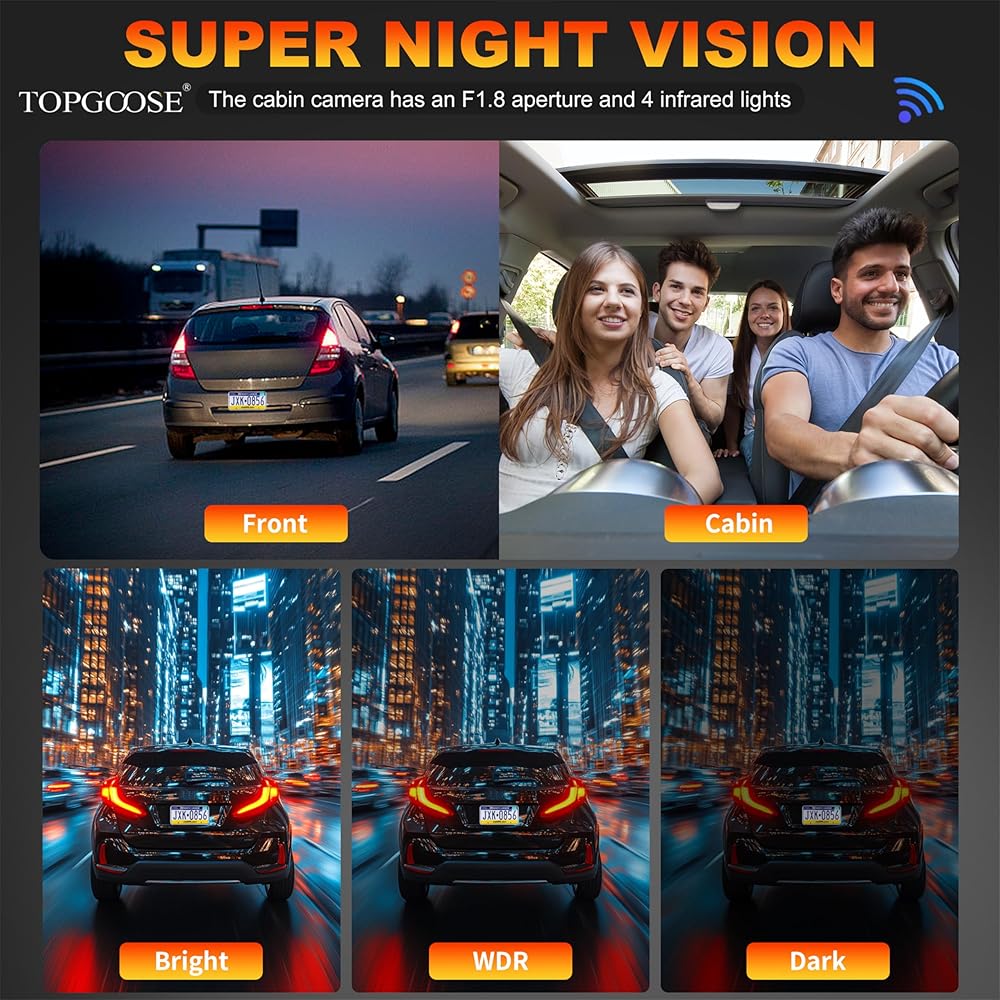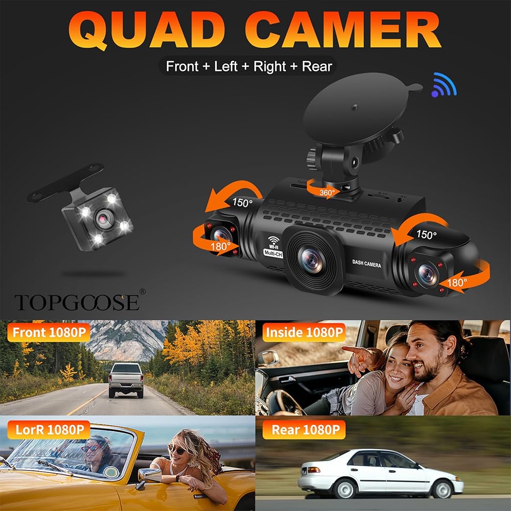 كاميرا داش كام ذات 4 قنوات عرض 360 درجة، TOPGOOSE 2K أمامي وخلفي من الداخل، كاميرا داش يمين يسار للسيارات، 8 مصابيح الأشعة تحت الحمراء للرؤية الليلية، 5G WiFi والتحكم في التطبيقات، مستشعر G، وضع انتظار السيارات، مع بطاقة SD مجانية سعة 64 جيجابايت