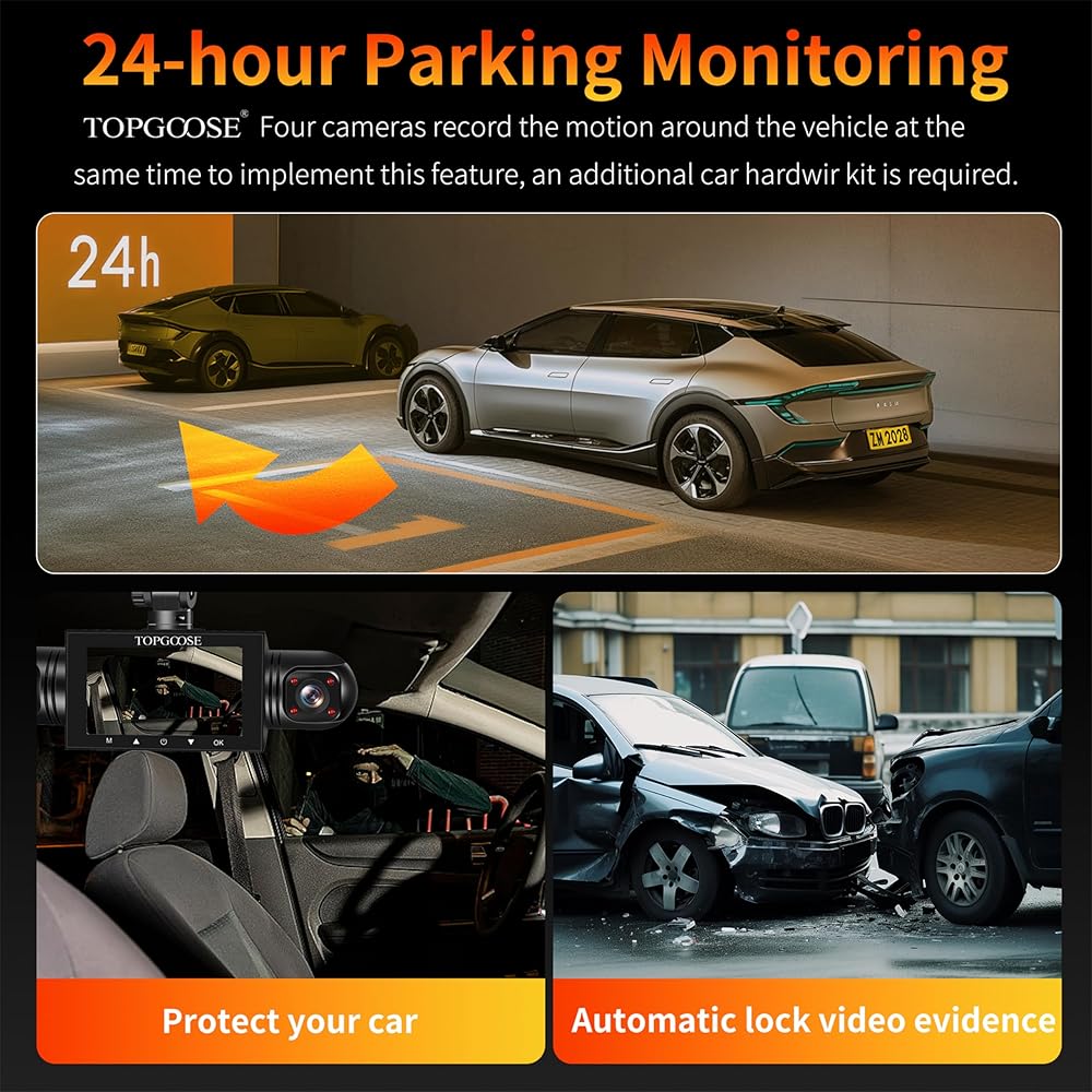 ✔【كاميرا داش كام 360 درجة من جميع الجوانب 4 قنوات】تحتوي كاميرا داش كام TOPGOOSE ذات 4 قنوات على 4 عدسات، جميعها قادرة على تسجيل فيديو FHD 2K في وقت واحد. يمكنه التقاط الجوانب الأمامية والخلفية واليسرى والأيمن للسيارة في وقت واحد. يمكن للعدسات الأربع الأمامية ضبط زاوية التصوير حتى تتمكن من التقاط المزيد من التفاصيل كما تريد. يمكنه تغطية 360 درجة بسهولة، مما يضمن عدم وجود زاوية ميتة حول السيارة. يمكنك استخدام عدسة واحدة لالتقاط الجزء الداخلي من سيارتك.