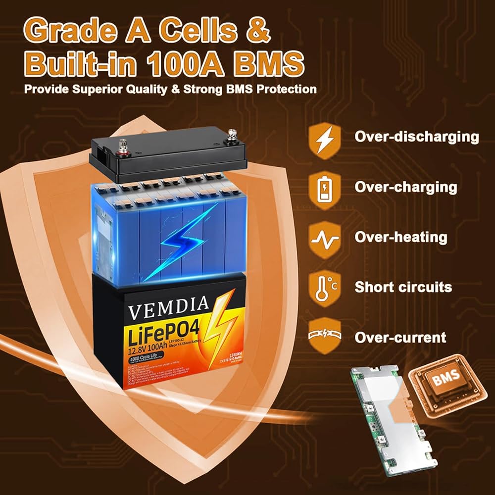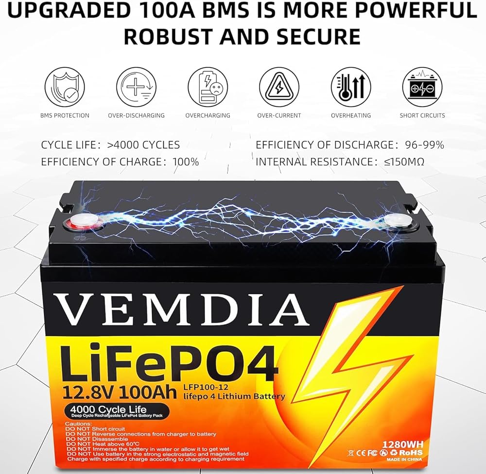 حماية BMS لبطاريات 12 فولت 100 أمبير في الساعة - تحتوي بطارية LiFePO4 الخاصة بنا على 100 أمبير BMS لحمايتها من الشحن الزائد والإفراط في التفريغ والتيار الزائد وارتفاع درجة الحرارة والدوائر القصيرة مع معدل تفريغ ذاتي ممتاز ومعدل تفريغ ذاتي منخفض ومعدل تفريغ مرتفع، مما يضمن مستوى أمان بطارية LiFePO4 وتحسين أداء البطارية 12 فولت. يمكن إعادة شحن البطارية بثلاث طرق، مكواة ليثيوم. شاحن بطارية فوسفات (يوصى بشاحن 14.6 فولت 20 أمبير، شحن سريع لمدة 5 ساعات)، لوحة شمسية مع وحدة تحكم ومولد كهربائي.