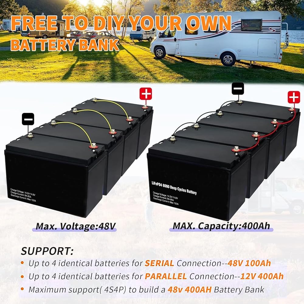 【تستخدم على نطاق واسع】- يمكن توصيل بطارية LiFePO4 بقدرة 12 فولت 100 أمبير بالتوازي وفي سلسلة للحصول على سعة أكبر. وحدات وقابلة للتطوير، تسمح بتمديدها حتى 4S أو 4P للحصول على سعة قصوى تبلغ 400 أمبير أو جهد بحد أقصى 48 فولت (51.2 فولت). يستخدم على نطاق واسع في معظم المناطق مثل RV، والطاقة الشمسية، والبطارية المنزلية، وخارج الشبكة، ومحرك صيد قارب الصيد، ومحطة الطاقة المحمولة والسكوتر الكهربائي، ومحرك صيد قارب الصيد، والإعاقة الكهربائية وما إلى ذلك.