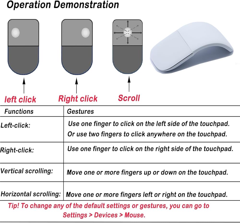 STRONG COMPATIBILITY: The arc mouse does not include a USB adapter, requires two 1.5V AAA dry batteries to work with, the package comes with two batteries. We recommend using fresh batteries, if the batteries are too low, the touch scroll bar may not work. To connect the mouse to a device, select the 4.0 MOUSE option and connect to a PC, Mac, Mac Book Pro and Mac Book Air