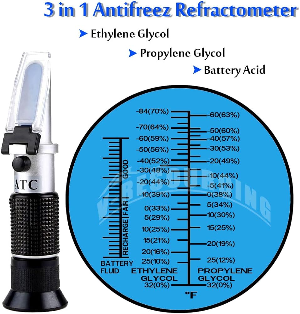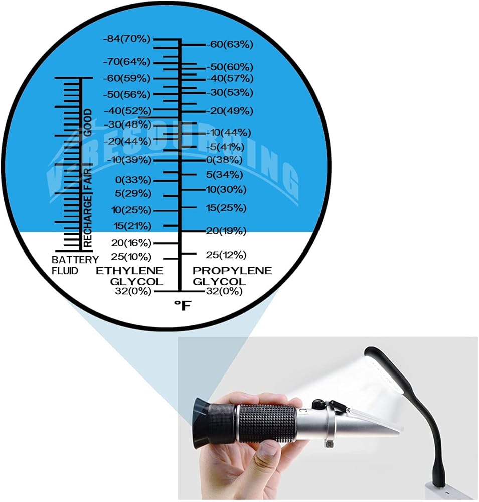 مقياس انكسار مضاد للتجمد في شاشة عرض درجة فهرنهايت (فهرنهايت)، جهاز اختبار سائل تبريد مضاد للتجمد محمول 3 في 1 لفحص نقطة التجمد، تركيز إيثيلين جلايكول أو بروبيلين جلايكول، حالة سائل البطارية